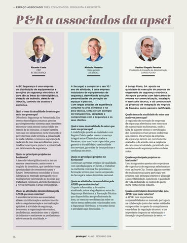 Qual o tema da atualidade do setor que mais vos preocupa? A expansão do mercado de empresas de segurança eletrónica com contratos de manutenção multimarcas, onde a falta de suporte técnico e certificação dos fabricantes criam graves problemas aos clientes. Os serviços da empresa de segurança devem ser corretamente avaliados e de acordo com a exigência de cada marca instalada, garantindo que os sistemas de segurança estão em boas mãos. Quais os principais projetos no horizonte? Uma das grandes apostas são os projetos de engenharia de segurança relacionados com as Smart City. Temos alguns convites de multinacionais para participar em projetos cujo principal objetivo é alcançar a sustentabilidade, segurança e qualidade de vida, reduzindo os custos de quem mora nestas novas cidades. Quais as atividades desenvolvidas pela APSEI que mais valoriza? A APSEI tem importantes responsabilidades no mercado português na colaboração junto das varias entidades competentes no apoio do cumprimento e na defesa da regulação do setor, e um importante impacto na valorização e formação de profissionais do setor. V