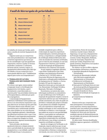ou temporárias, Pontos de Ancoragem, Andaimes, Guarda Corpos e Redes de Segurança, e no que toca a Equipamentos de Protecção Individual, dizem respeito a Arneses, Cordas, Mosquetões, Roldanas, Cintas de Amarração, Dispositivos de Acesso por Cordas, Dispositivos AntiQueda retrácteis, Dispositivos Anti-Queda e Dispositivos de Resgate. Por último e no que se refere a algumas recomendações, destacamos o seguinte: a) A quisição adequada de Equipamentos Normalizados; b) Garantia de Manutenção indicada pelo Fabricante assegurada pelo Representante ou Fornecedor; c) Evidência de Certificação do Representante ou Distribuidor; d) Execução de Verificação Extra em caso da eventual partilha de Equipamentos; e) Reinspecção de Equipamentos após situação de Queda em Altura; f) E missão de Certificado de Inspecção ou Relatório; g) C umprimento da Validade da Inspecção. Estamos certos que, cumprindo com estes pressupostos e recomendações acima expressas, estamos seguramente a contribuir para uma melhoria da qualidade dos serviços prestados pelos Técnicos de Trabalhos em Altura que, por força das condições naturais do desenvolvimento da sua actividade, não possuem efectivamente margem para erro! Só, deste modo, Técnicos Qualificados trabalham seguros e garantem o ACIDENTE ZERO! V