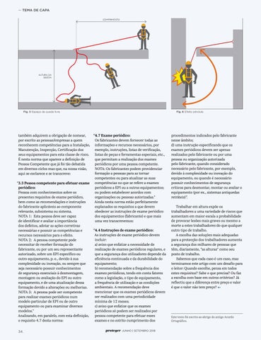 “4.7 Exame periódico: também adquirem a obrigação de nomear, Os fabricantes devem fornecer todas as por escrito as pessoas/empresas a quem reconhecem competências para a Instalação, informações e recursos necessários, por exemplo, instruções, listas de verificação, Manutenção, Inspecção, Certificação dos listas de peças e ferramentas especiais, etc., seus equipamentos para esta classe de risco. que permitam a realização dos exames É nesta norma que aparece a definição de periódicos por uma pessoa competente. Pessoa Competente que já foi tão debatida NOTA: Os fabricantes podem providenciar em diversos ciclos mas que, na nossa visão, formação a pessoas para as tornar aqui se esclarece e se transcreve: competentes ou para atualizar as suas “3.3 Pessoa competente para efetuar exame competências no que se refere a exames periódicos a EPI ou a outros equipamentos; periódico: ou podem estabelecer acordos com Pessoa com conhecimentos sobre os organizações ou pessoas autorizadas.” presentes requisitos de exame periódico, Ainda nesta norma estão perfeitamente bem como as recomendações e instruções explanados os requisitos a que devem do fabricante aplicáveis ao componente obedecer as instruções de exame periódico relevante, subsistema ou sistema. dos equipamentos (fabricante) e que mais NOTA 1: Esta pessoa deve ser capaz uma vez transcrevemos: de identificar e avaliar a importância dos defeitos, adotar as ações corretivas “4.4 Instruções de exame periódico: necessárias e possuir as competências e As instruções de exame periódico devem recursos necessários para o efeito. incluir: NOTA 2: A pessoa competente pode a) aviso que enfatize a necessidade de necessitar de receber formação do realização de exames periódicos regulares, e fabricante, ou por um seu representante que a segurança dos utilizadores depende da autorizado, sobre um EPI específico ou eficiência continuada e da durabilidade do outro equipamento, p. e., devido à sua equipamento; complexidade ou inovação, ou sempre que b) recomendação sobre a frequência dos seja necessário possuir conhecimentos exames periódicos, tendo em conta fatores de segurança essenciais à desmontagem, como a legislação, o tipo de equipamento, montagem ou avaliação do EPI ou outro a frequência de utilização e as condições equipamento, e de uma atualização dessa ambientais. A recomendação deve formação devido a alterações ou melhorias. mencionar que os exames periódicos devem NOTA 3: A pessoa pode ser competente ser realizados com uma periodicidade para realizar exames periódicos num mínima de 12 meses; modelo particular de EPI ou de outro c) aviso que enfatize que os exames equipamento ou para examinar diversos periódicos só podem ser realizados por modelos.” pessoa competente para efetuar esses Analisando, em paralelo, com esta definição, exames e no estrito cumprimento dos o requisito 4.7 desta norma: 34.