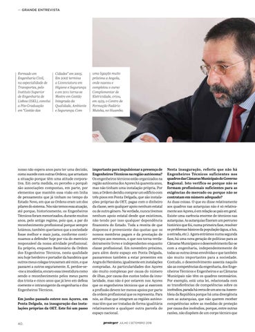 importante para impulsionar a presença de Engenheiros Técnicos na região autónoma? Os engenheiros técnicos estão organizados na região autónoma dos Açores há quarenta anos, mas não tinham uma instalação própria. Por isso, a Ordem decidiu comprar um edifício com três pisos em Ponta Delgada, que são instalações próprias da OET, pagas com o dinheiro da classe, sem qualquer apoio nenhum estatal ou de outro género. Na verdade, nunca tivemos nenhum apoio estatal desde que existimos, não tendo por isso qualquer dependência financeira do Estado. Toda a receita de que dispomos é proveniente das quotas que os nossos membros pagam e da prestação de serviços aos mesmos, o que nos torna verdadeiramente livres e independentes enquanto classe profissional. Em novembro próximo, para além deste espaço em Ponta Delgada, passaremos também a estar presentes em Angra do Heroísmo, igualmente em instalações compradas. As particularidades dos Açores são muito complexas por causa do número de ilhas, por causa dos custos todos da insularidade, mas não é por estarem nos Açores que os engenheiros técnicos que aí exercem a profissão devem ter menos apoios por parte da ordem profissional que os representa. Para nós, as ilhas que integram as regiões autónomas têm que ser tratadas de forma igualitária relativamente a qualquer outra parcela do espaço nacional. proteger JULHO | SETEMBRO 2018