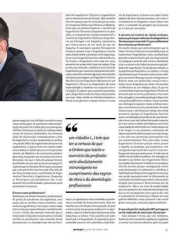 cia da Engenharia, inclusive nos mais triviais aspetos do dia-a-dia das pessoas, tais como o incómodo de ao chegarem a casa a chave não abrir, o comando da garagem não funcionar ou a Internet não existir. E perante tal cenário de rápida evolução, quais as principais valências dos Engenheiros Técnicos para o mercado? O que os diferencia dos restantes profissionais? Há muito tempo que percecionamos que ia haver muitas mudanças na sociedade e que as tradicionais Engenharias eram insuficientes para dar resposta àquilo que nós organizamos em colégios e, perante este cenário, decidimos criar no estatuto da Ordem dezasseis especialidades de engenharia. Na revisão do estatuto, a Assembleia da República, ou melhor, a Troika não permitiu que criássemos dois novos colégios que eram a Bioengenharia e a Engenharia Biónica (mas um destes dias vamos criar) e estas novas Engenharias estão encaixadas na Mecânica ou em colégios afins. O que eu costumo dizer é que um Engenheiro Técnico vê primeiro que os outros e, portanto, o ver antes tem vantagens, nomeadamente para depois ter uma prática diferente e melhor. O que também nos distingue enquanto classe profissional é que, como fomos muito prejudicados durante muitos anos, e até há pouco tempo isso ainda acontecia, (porque os Engenheiros Técnicos eram considerados possuidores de uma formação menor, que não tinham formação superior ou eram menos cultos), nós forjámos uma certa capacidade de sobrevivência e habituámo-nos a ver longe e a ver primeiro, cultivando até algum espírito de abertura para as coisas novas, e isso tem-nos permitido anteciparmo-nos aos acontecimentos. Por outro lado, somos Engenheiros Técnicos porque temos prazer e orgulho na profissão, que exercemos, com um grande espírito de bem servir e com confiança nos atos que praticamos. E tudo isso se reflete numa Ordem moderna. Por exemplo, os membros da Ordem dos Engenheiros Técnicos podem facilmente trabalhar em qualquer sítio do mundo porque conseguimos emitir uma declaração via telemóvel a certificar a habilitação profissional do engenheiro técnico, não sendo necessário este vir fisicamente às instalações da Ordem para obter o documento exigido para praticar determinado ato de engenharia. Isto é um sinal de modernidade que nós quisemos dar exatamente porque tem que se ser consequente com o que se diz, não se podendo ter um discurso e depois ter uma prática diferente, como acontece com muita gente neste país, incluindo alguns políticos. E essa solução foi criada pela OET portuguesa ou foi replicada de outro país da europa? Esta solução é única, que nós saibamos. Estamos neste momento a ajudar os angolanos a montar um sistema idêntico, pois num país 41.