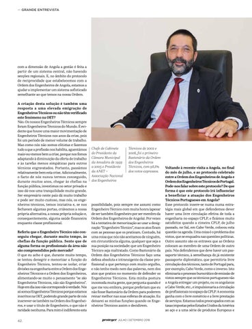 com a dimensão de Angola a gestão é feita a partir de um sistema central, não havendo secções regionais. E, no âmbito do protocolo de reciprocidade que estabelecemos com a Ordem dos Engenheiros de Angola, estamos a ajudar a implementar um sistema sofisticado semelhante ao que temos na nossa Ordem. A criação desta solução é também uma resposta a uma elevada emigração de Engenheiros Técnicos ou não têm verificado este fenómeno na OET? Não. Os nossos Engenheiros Técnicos sempre foram Engenheiros Técnicos do Mundo. É evidente que houve uma maior movimentação de Engenheiros Técnicos nos anos da crise, pois foi um período de menor volume de trabalho. Mas como nós não somos elitistas e fazemos tudo a que a profissão nos habilita, aguentámos mais-ou-menos bem a crise, porque nos fomos adaptando à diminuição da oferta de trabalho e às tarefas menos simpáticas para outros técnicos engravatados. Portanto, passámos relativamente bem esta crise. Adicionalmente, o facto de nós nunca termos conseguido, durante muitos anos, chegar às chefias na função pública, investimos no setor privado e isso dá-nos uma tranquilidade muito grande. Ser empresário neste país dá muito trabalho e pode ser muito custoso, mas nós, os engenheiros técnicos, temos iniciativa e, se nos fechavam algumas portas, criávamos a nossa própria alternativa, a nossa própria solução e, consequentemente, alguma saúde financeira enquanto classe profissional. Referiu que o Engenheiro Técnico não conseguiu chegar, durante muito tempo, às chefias da função pública. Sente que de alguma forma os profissionais da área não são compreendidos pelo mercado? O que eu acho é que, durante muito tempo, se tentou denegrir e menorizar a função do Engenheiro Técnico, tentou-se isolar, criar divisões na engenharia entre a Ordem dos Engenheiros Técnicos e a Ordem dos Engenheiros, alimentando-se muito o pensamento “se são Engenheiros Técnicos, não são Engenheiros”. Hoje em dia isso não corresponde à verdade. Nós só somos Engenheiros Técnicos porque estamos inscritos na OET, podendo grande parte de nós inscrever-se também na Ordem dos Engenheiros, e usar o título de Engenheiro, o que não é raridade nenhuma. Para mim é indiferente esta 42.