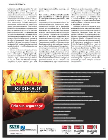 missível, pois estamos a falar da proteção das pessoas e bens. Para terminar, o Sr. Bastonário foi reeleito para o quadriénio de 2018/2021. Quais os marcos que quer alcançar durante este mandato? Gostaria muito que acabasse a dicotomia Universidade/Politécnicos. É uma batalha nossa, de há muitos anos, para que os politécnicos possam dar doutoramentos e eu penso que esta medida será concretizada ainda durante este meu mandato. O outro grande desígnio que prossigo é a implantação da concelhia da Ordem, ou seja, ter em cada concelho um delegado e representantes da OET para acompanhar de perto os projetos aí desenvolvidos. Neste momento a Madeira é já um exemplo de funcionamento deste sistema. Gostava também que as Ordens Profissionais em Portugal tivessem uma postura bem mais construtiva e não tão sindicalista ou corporativista como algumas têm tido. Algumas Ordens tornaram-se forças políticas quando não o podem. Uma Ordem não pode apoiar uma greve. Quando um Bastonário de uma Ordem Profissional apoia uma greve, a promove e estimula, não está a cumprir a sua função. A Ordem é um órgão da Administração