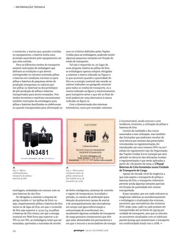 com os critérios definidos pelas Nações Unidas para as embalagens, podendo existir algumas pequenas variações em função do modo de transporte. Tal não é requerido se, no lugar da nova etiqueta relativa às pilhas de lítio, as embalagens apenas estejam obrigadas a ostentar a marca indicada na Figura 2 (o que acontece quando a quantidade de lítio ou a energia nominal não excede os valores indicados no parágrafo anterior) para todos os modos de transporte, ou a marca indicada na figura 3 (exclusivamente para transporte aéreo e que até ao final de 2018 poderá ser uma alternativa à marca indicada na figura 2). Com a disseminação dos sistemas telemáticos, como por exemplo: sistemas