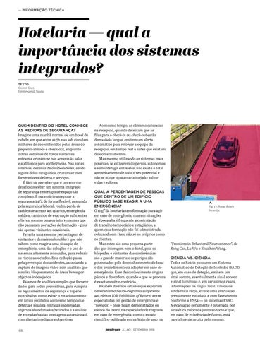Ao mesmo tempo, as câmaras colocadas na recepção, quando detectam que as filas para o check-in ou check-out estão demasiado longas, emitem um alerta automático para reforçar a equipa da recepção, em tempo real e antes que existam descontentamentos. Mas mesmo utilizando os sistemas mais potentes, se estiverem dispersos, autónomos e sem interagir entre eles, não existe o total aproveitamento de todo o seu potencial e não se atinge o patamar almejado: salvar vidas e valores. QUAL A PERCENTAGEM DE PESSOAS QUE DENTRO DE UM EDIFÍCIO PÚBLICO SABE REAGIR A UMA EMERGÊNCIA? O staff da hotelaria tem formação para agir em caso de emergência, mas em situações de época alta é frequente a contratação de trabalho temporário e estagiários, a quem essa formação não foi administrada, colocando em risco não só os próprios como os clientes. Mas estes são uma pequena parte dos que interagem com o hotel, pois os hóspedes e visitantes das conferências são a grande maioria e os perigos são potenciados pelo desconhecimento do local e dos procedimentos a adoptar em caso de emergência. Esse desconhecimento origina pânico e desordem, quando o que se procura é exactamente o contrário. Existem diversos estudos que exploram o mecanismo neuro-cognitivo subjacente aos efeitos IOR (Inhibition of Return) entre especialistas em gestão de emergência e “noviços” – onde ficam demonstrados os efeitos do treino na capacidade de resposta em caso de emergência, como o estudo científico publicado em 22 Maio de 2017 na proteger JULHO | SETEMBRO 2018