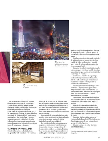 interação de vários tipos de sistemas, para a criação de um sistema único que crie uma solução para a enorme complexidade que é um hotel, aliado ao factor mais imprevisível de todos: o factor Homem — que reage, a larga maioria das vezes, de forma totalmente surpreendente. Um exemplo de integração é a interação simples entre os sistemas de videovigilância, controlo de acessos, áudio, televisão e incêndio (exemplo base e básico). Em caso de incêndio, automaticamente surgem no monitor dos recepcionistas as imagens das câmaras mais próximas do local, sem necessidade de deslocação a esse local (com a consequente perda de tempo e staff). Após verificar que é um alarme real, proteger JULHO | SETEMBRO 2018