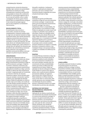 dos perfis, resistência, o isolamento acústico e a aplicação por projeção, em particular, que torna a solução muito económica quando comparada com outras soluções de proteção ao fogo. PLACAS Colocação de painéis pré-fabricados resistentes ao fogo em torno dos elementos estruturais a proteger. A espessura das placas varia em função das características do perfil a proteger, tais como a temperatura crítica e a massividade, e do tipo de produto e sua resistência ao fogo. Podem ser aplicados em caixão ou por ecrã e podem ser utilizados como paredes ou tetos falsos. Podem ser utilizados vários materiais, tais como silicato fibroso ou de cálcio, betão, fibrocimento, vermiculite, perlite, gesso, etc. e é necessário ter atenção especial às ligações entre os painéis e entre estes e os perfis metálicos. As placas de proteção contra incêndio também possuem resistência ao impacto e à abrasão, permitem o isolamento acústico, a sua instalação é limpa e com poucos resíduos e podem ser instalados em edifícios já em utilização. MANTAS As mantas fibrosas resistentes ao fogo são outra alternativa de proteção passiva de elementos metálicos contra incêndios. O seu funcionamento é semelhante ao dos outros métodos, atuando como um revestimento de baixa condutibilidade térmica que atrasa os efeitos das altas temperaturas nos metais. Podem ser aplicadas em fase de utilização do edifício, sendo fixadas no contorno das vigas ou pilares, com o auxílio de pinos metálicos previamente soldados. Os materiais mais comuns são o silicato fibroso, as fibras cerâmicas e as fibras minerais, como a lã de vidro ou a lã de rocha. Este método apresenta uma instalação limpa, com libertação de poucos resíduos, permite o isolamento acústico e as cargas introduzidas na estrutura são reduzidas. SISTEMAS DE PINTURAS/ REVESTIMENTOS ORGÂNICOS INTUMESCENTES Aplicação de um sistema constituído por um revestimento de proteção intumescente no contorno dos elementos a proteger. O sistema é em geral constituído por um elemento primário, um revestimento intumescente e por pintura de acabamento, que, sob a ação do calor, aumenta de volume, formando uma camada de material termo-isolante que protege as superfícies pintadas/revestidas e retarda o momento da temperatura crítica. Estes proteger JULHO | SETEMBRO 2018