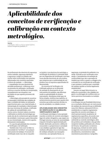 no âmbito e nos domínios da metrologia: a certificação de produtos é a atestação dada por um Organismo de Certificação, com base numa decisão decorrente de uma análise, que comprova que a conformidade de um produto com os requisitos especificados foi demonstrada. Os conceitos de Verificação e de Calibração aplicam-se na dimensão de avaliação do desempenho de um instrumento de medição, cuja diferença reside na aplicabilidade do próprio instrumento. Abordamos então aqui, de forma simples, sintética mas explicita, os esclarecimentos possíveis para aqueles dois conceitos que ainda suscitam dúvidas no seio da sociedade e no cidadão comum. APLICABILIDADE DOS CONCEITOS DE VERIFICAÇÃO E CALIBRAÇÃO. VERIFICAÇÃO O QUE É? A verificação metrológica é uma operação inserida no âmbito do controlo metrológico legal, de caráter obrigatório, cuja origem em Portugal remonta ao início da nacionalidade, enquanto disciplina regulamentada pelo Estado, destinada a promover a defesa do consumidor e a proporcionar à sociedade e aos cidadãos a garantia do rigor das medições efetuadas com os instrumentos de medição utilizados nas transações comerciais, nas operações fiscais, na proteger JULHO | SETEMBRO 2018