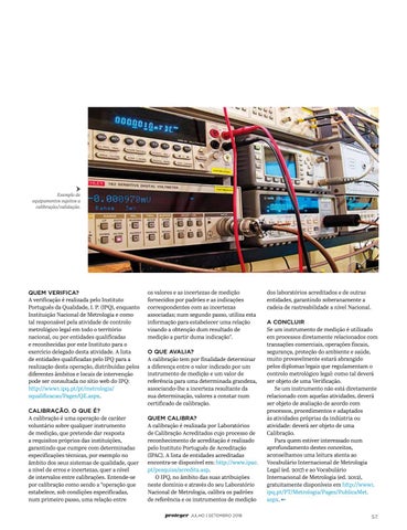 dos laboratórios acreditados e de outras entidades, garantindo soberanamente a cadeia de rastreabilidade a nível Nacional. A CONCLUIR Se um instrumento de medição é utilizado em processos diretamente relacionados com transações comerciais, operações fiscais, segurança, proteção do ambiente e saúde, muito provavelmente estará abrangido pelos diplomas legais que regulamentam o controlo metrológico legal: como tal deverá ser objeto de uma Verificação. Se um instrumento não está diretamente relacionado com aquelas atividades, deverá ser objeto de avaliação de acordo com processos, procedimentos e adaptados às atividades próprias da indústria ou atividade: deverá ser objeto de uma Calibração. Para quem estiver interessado num aprofundamento destes conceitos, aconselhamos uma leitura atenta ao Vocabulário Internacional de Metrologia Legal (ed. 2017) e ao Vocabulário Internacional de Metrologia (ed. 2012), gratuitamente disponíveis em http://www1. ipq.pt/PT/Metrologia/Pages/PublicaMet. aspx. V 57.