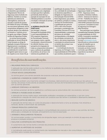 Benefícios da normalização. — MELHORAR PRODUTOS E SERVIÇOS A aplicação das normas pode conduzir a uma melhoria na qualidade dos produtos e serviços, resultando no aumento progressivo do volume de vendas. — ATRAIR NOVOS CONSUMIDORES As normas geram uma correta perceção dos produtos e serviços, atraindo potenciais consumidores. — AUMENTAR A MARGEM DE COMPETITIVIDADE As normas conferem uma importante vantagem às empresas, relativamente aos concorrentes que não aplicam as normas, até porque muitos setores só adquirem produtos e serviços de fornecedores que demonstrem a conformidade com as normas aplicáveis. — AGREGAR CONFIANÇA AO NEGÓCIO As normas aumentam de forma significativa a confiança que os consumidores têm nos produtos e serviços. — DIMINUIR A POSSIBILIDADE DE ERROS A aplicação de normas implica seguir orientações analisadas e ensaiadas por especialistas, o que tem como consequência a redução de custos e de tempo com produtos que não tenham a qualidade e desempenho desejáveis. — REDUZIR CUSTOS DE NEGÓCIO A aplicação de normas reduz os custos de pesquisas e desenvolvimento e torna as empresas mais eficientes e rentáveis, devido à dinamização das operações. — TORNAR PRODUTOS COMPATÍVEIS A aplicação de normas pertinentes assegura a compatibilidade dos produtos com outros, o que contribui de forma efetiva para a ampliação do mercado, principalmente ao nível da exportação. — ATENDER A REGULAMENTOS TÉCNICOS As normas podem auxiliar o cumprimento de obrigações legais, como por exemplo no âmbito da segurança dos produtos e proteção ambiental. — FACILITAR A EXPORTAÇÃO DOS PRODUTOS O cumprimento das normas facilita a entrada dos produtos em mercados externos. — AUMENTAR AS HIPÓTESES DE SUCESSO A normalização pode ajudar no conhecimento das necessidades do mercado e dos consumidores, o que pode contribuir para o sucesso dos produtos. proteger JULHO | SETEMBRO 2018