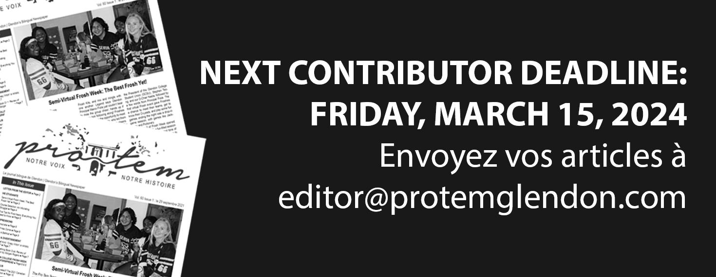 N’oubliez pas que notre dernière date limite est demain, le 15 mars ! J’attends vos contributions avec impatience. Please feel free to write about anything on your mind, Pro Tem truly strives to be Glendon’s voice.