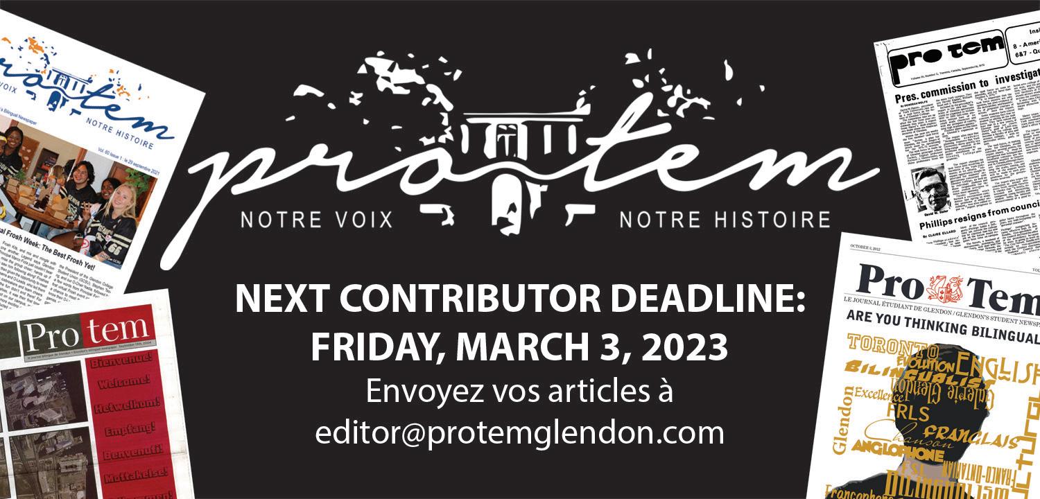 À tous nos étudiants de retour, bienvenue ! Et à ceux qui nous rejoignent pour la première fois à Glendon, nous vous souhaitons un accueil chaleureux et ethousiaste. J’espère que vous vous adaptez bien à l’effervescence de la vie académique et que vous vous préparez pour une année fantastique. A big thank you to the Pro Tem team for their dedication in putting this issue together, and to our contributors for their fantastic articles. Your support means everything, and we’re thrilled to have you along for this journey.