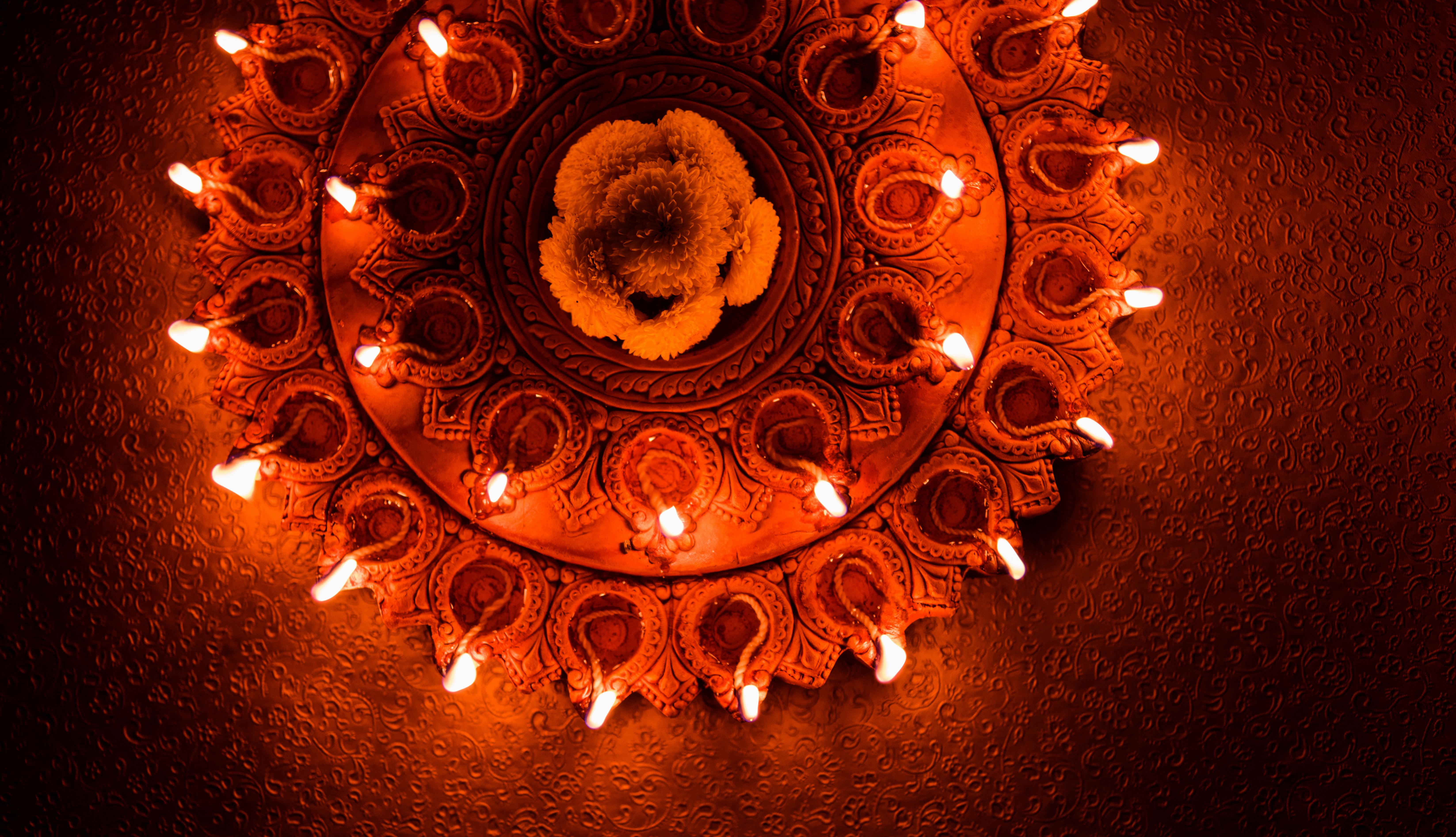 Deepavali is derived from the Sanskrit word "Deepvali" and means a string of lights. The lights burn in a diya.