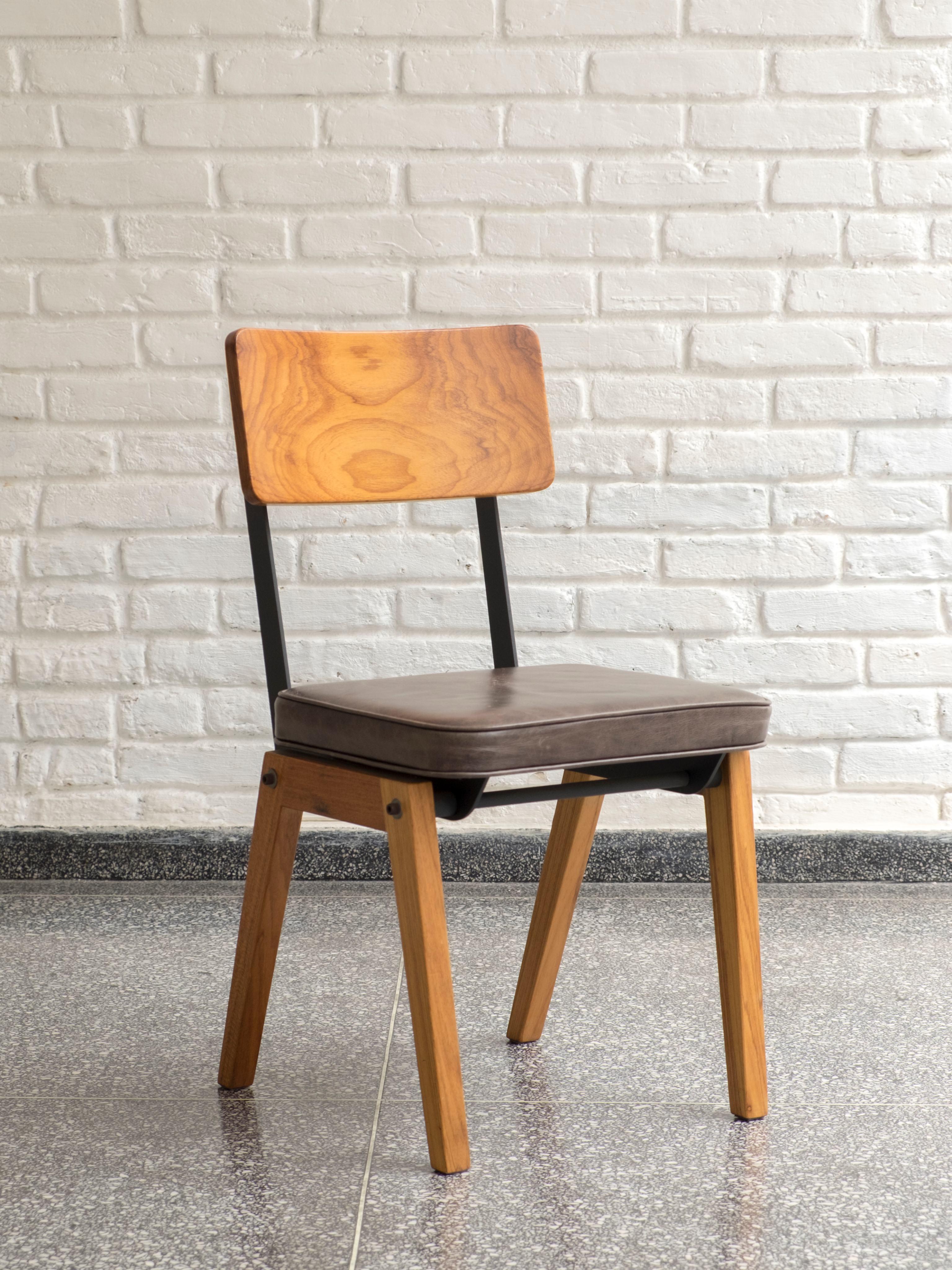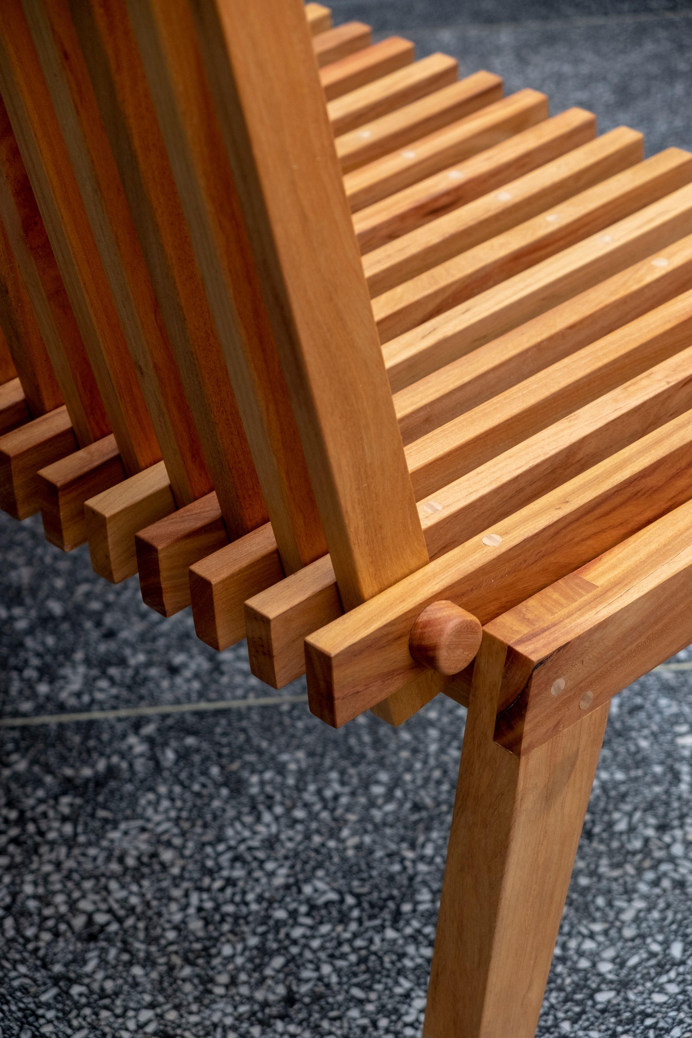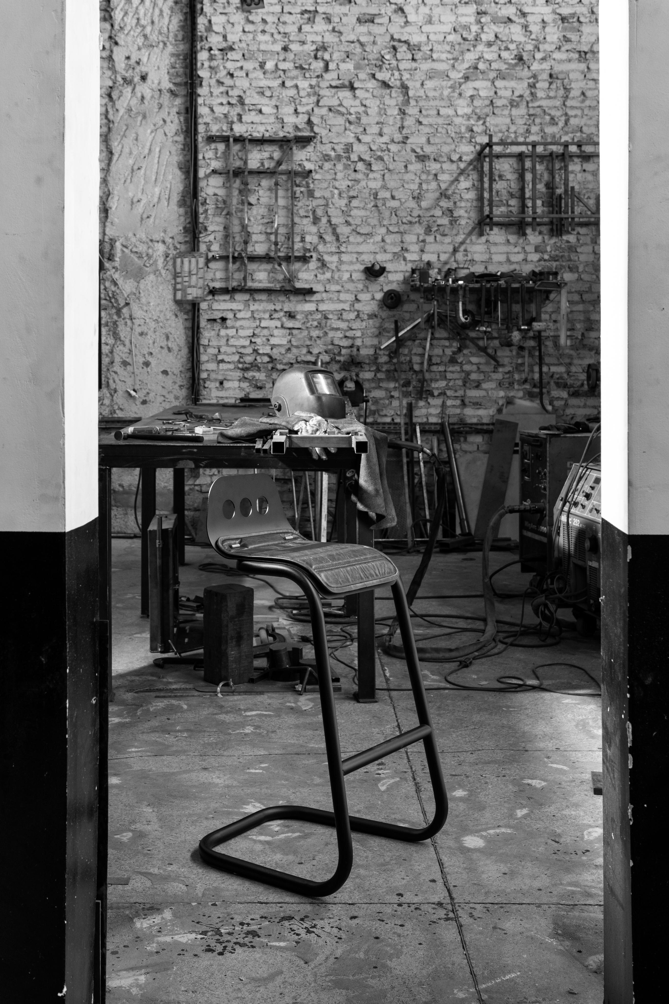 O design celebra o sistema construtivo, destacando parafusos, dobras e soldas como elementos dignos de apreciação.
