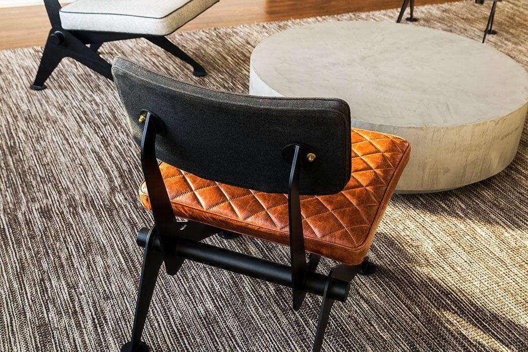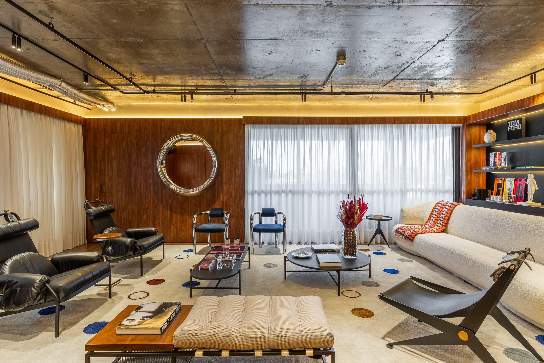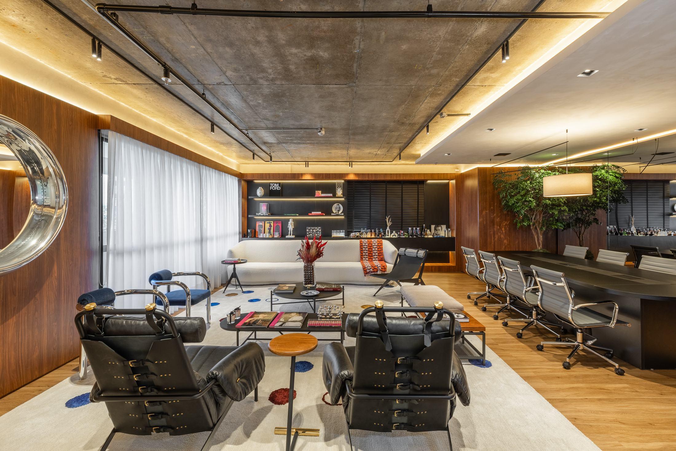 Na concepção da sala de diretoria, a mistura da sofisticação e estilo industrial, com as peças assinadas Prototype.