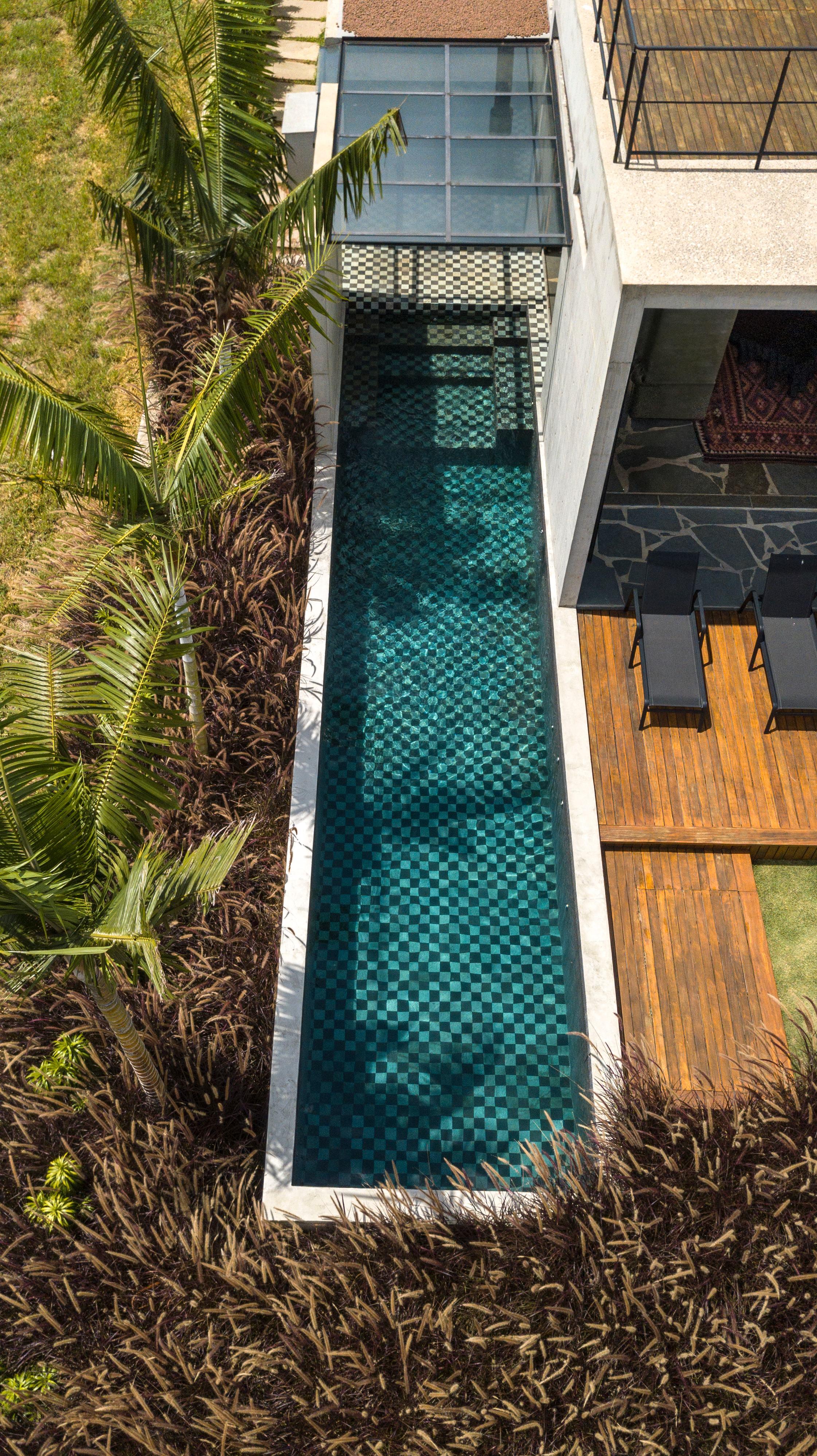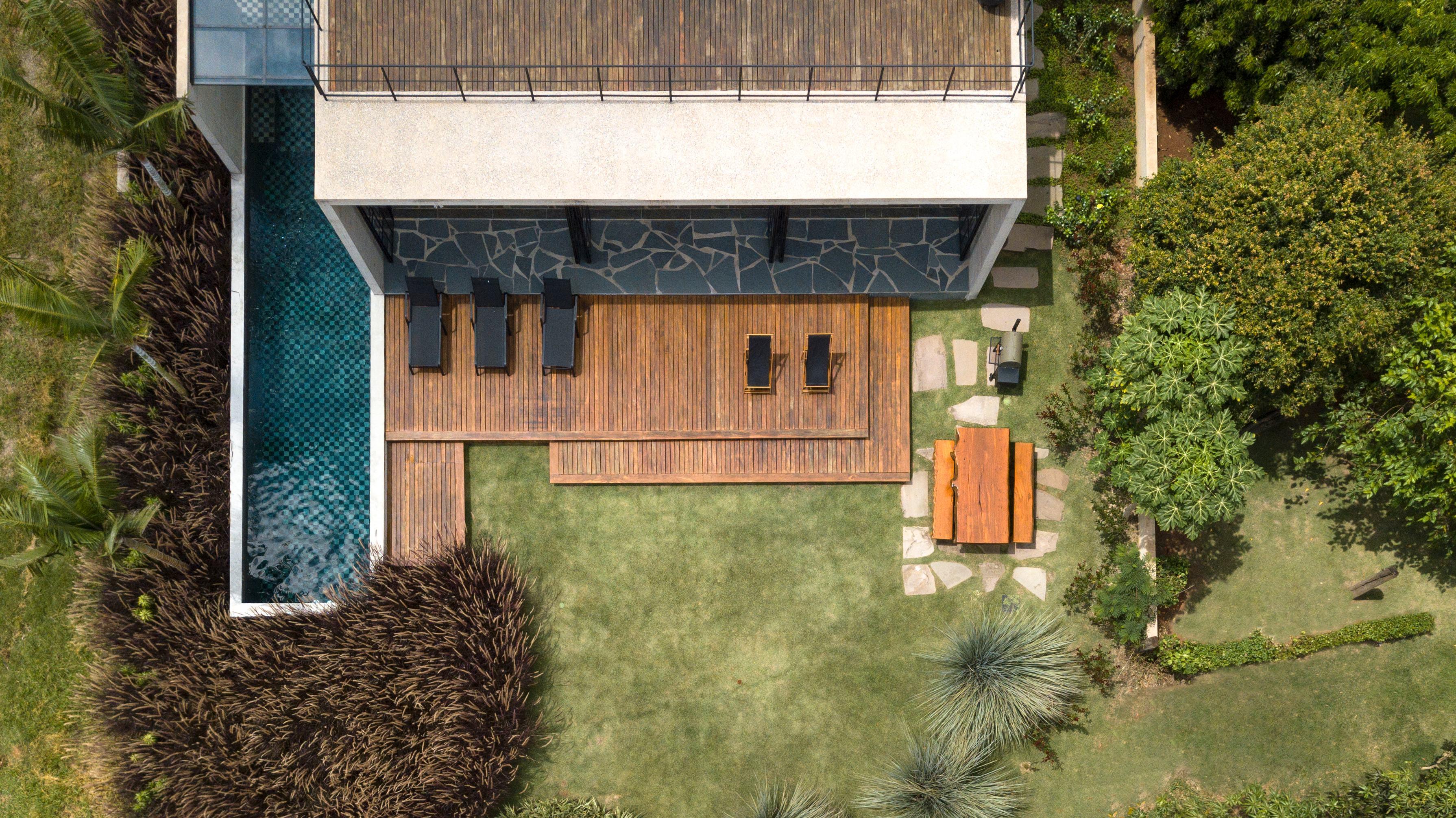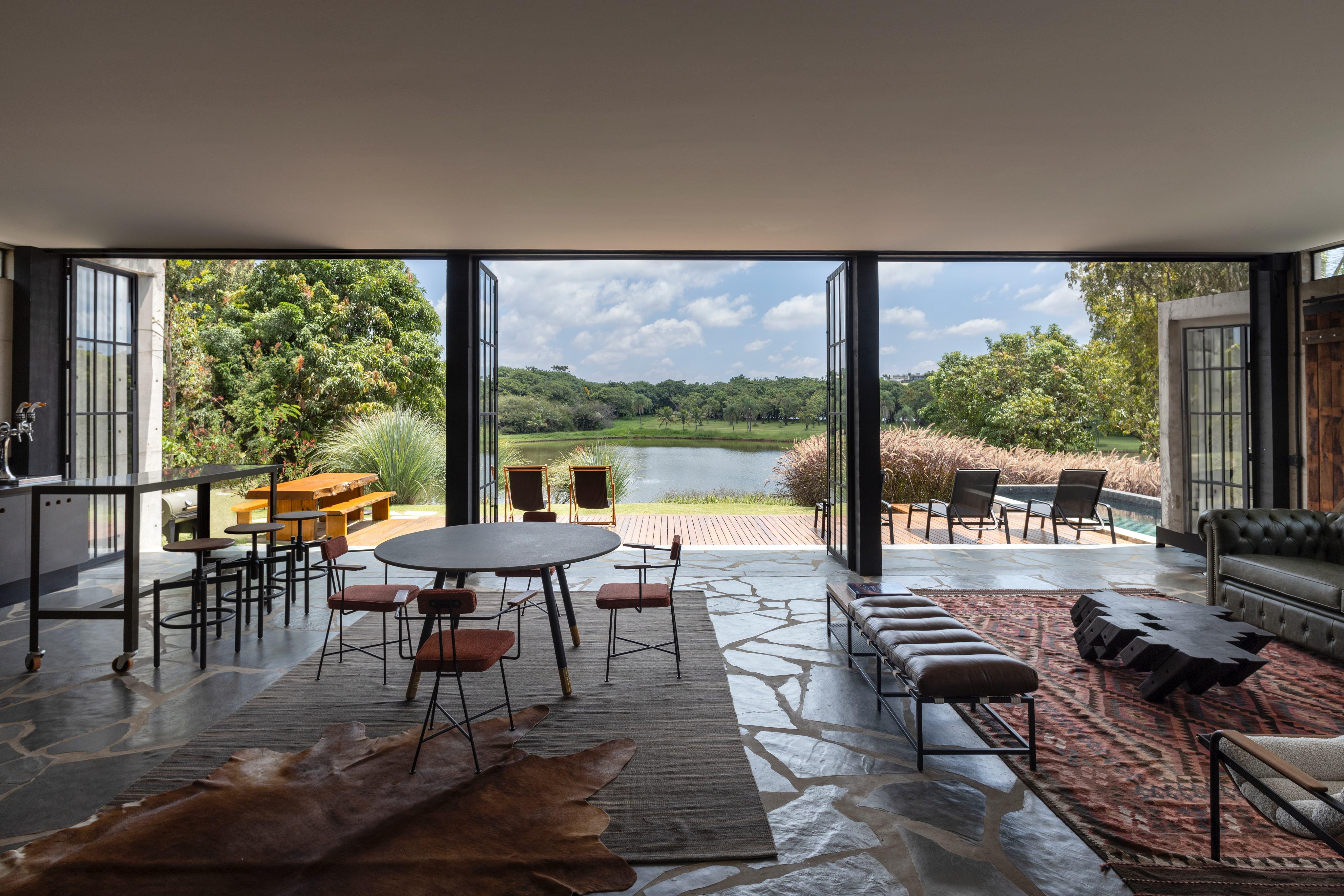 As esquadrias abrem de forma a trazer a natureza como uma extensão da casa, enquanto a piscina aproxima o lago e tem acesso não apenas do jardim, mas também da sala e da sauna.