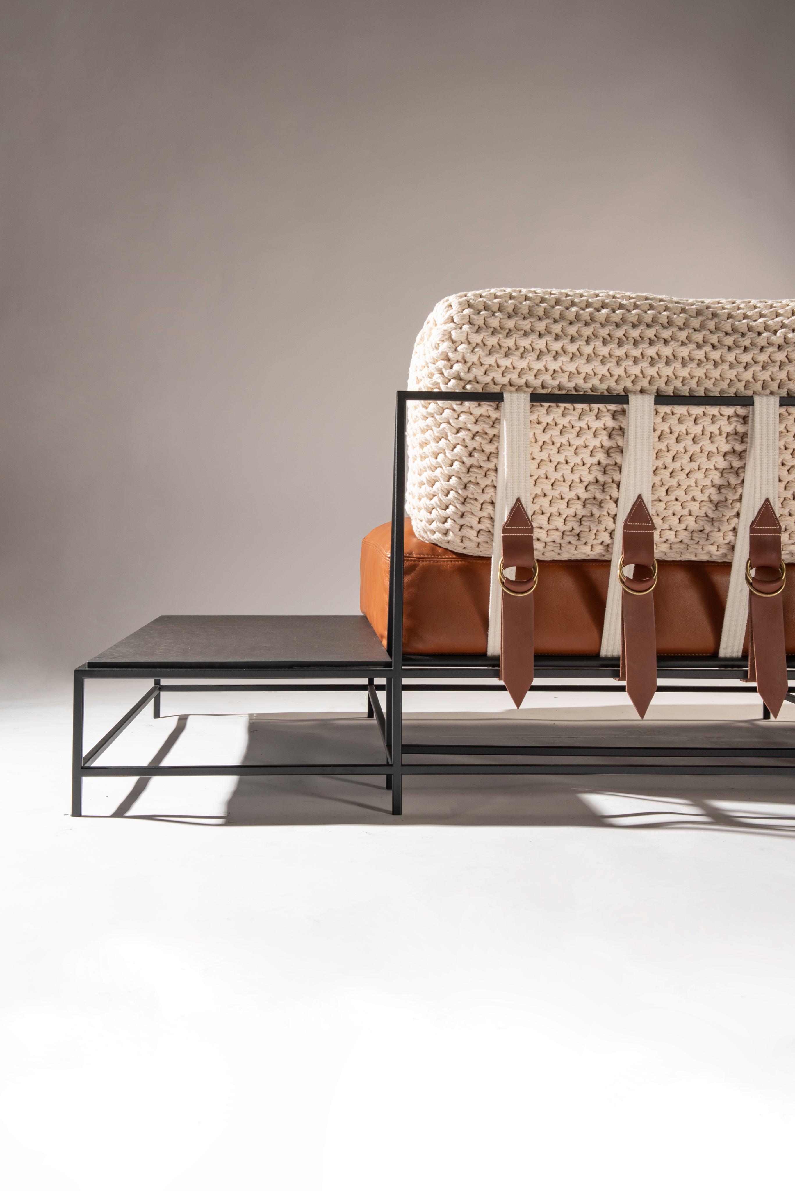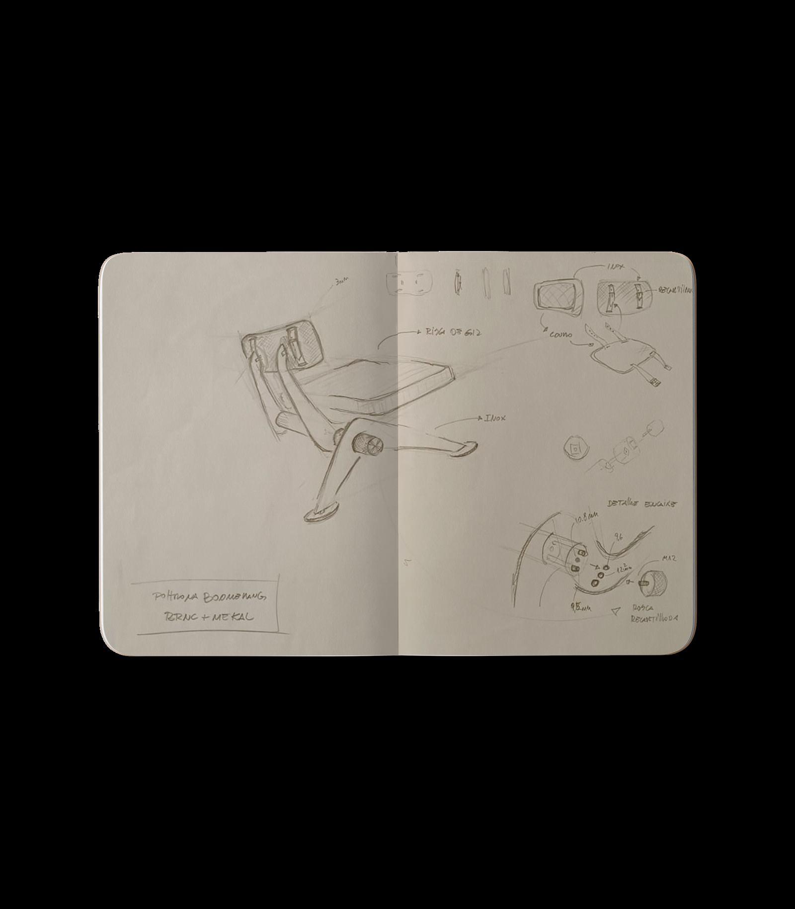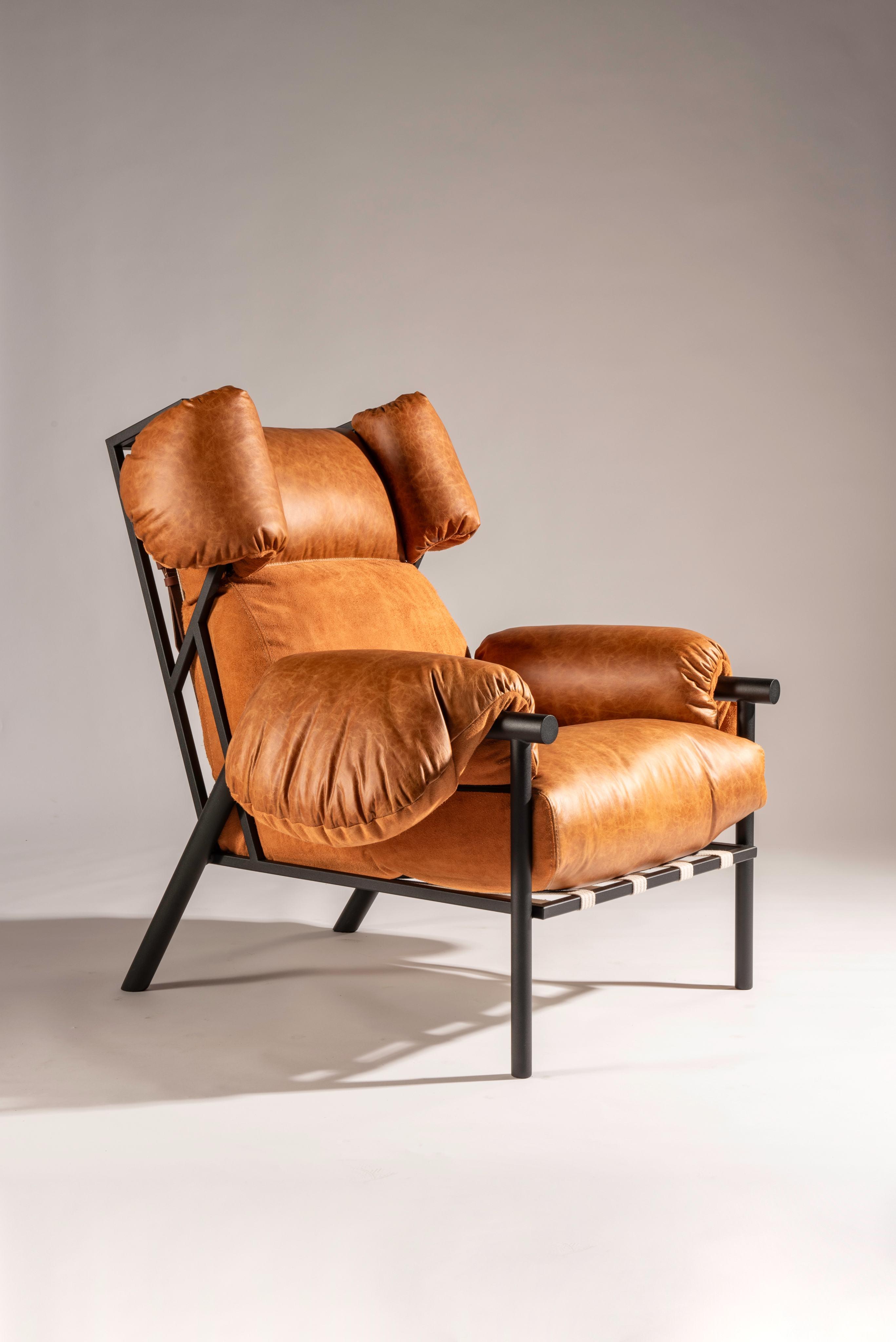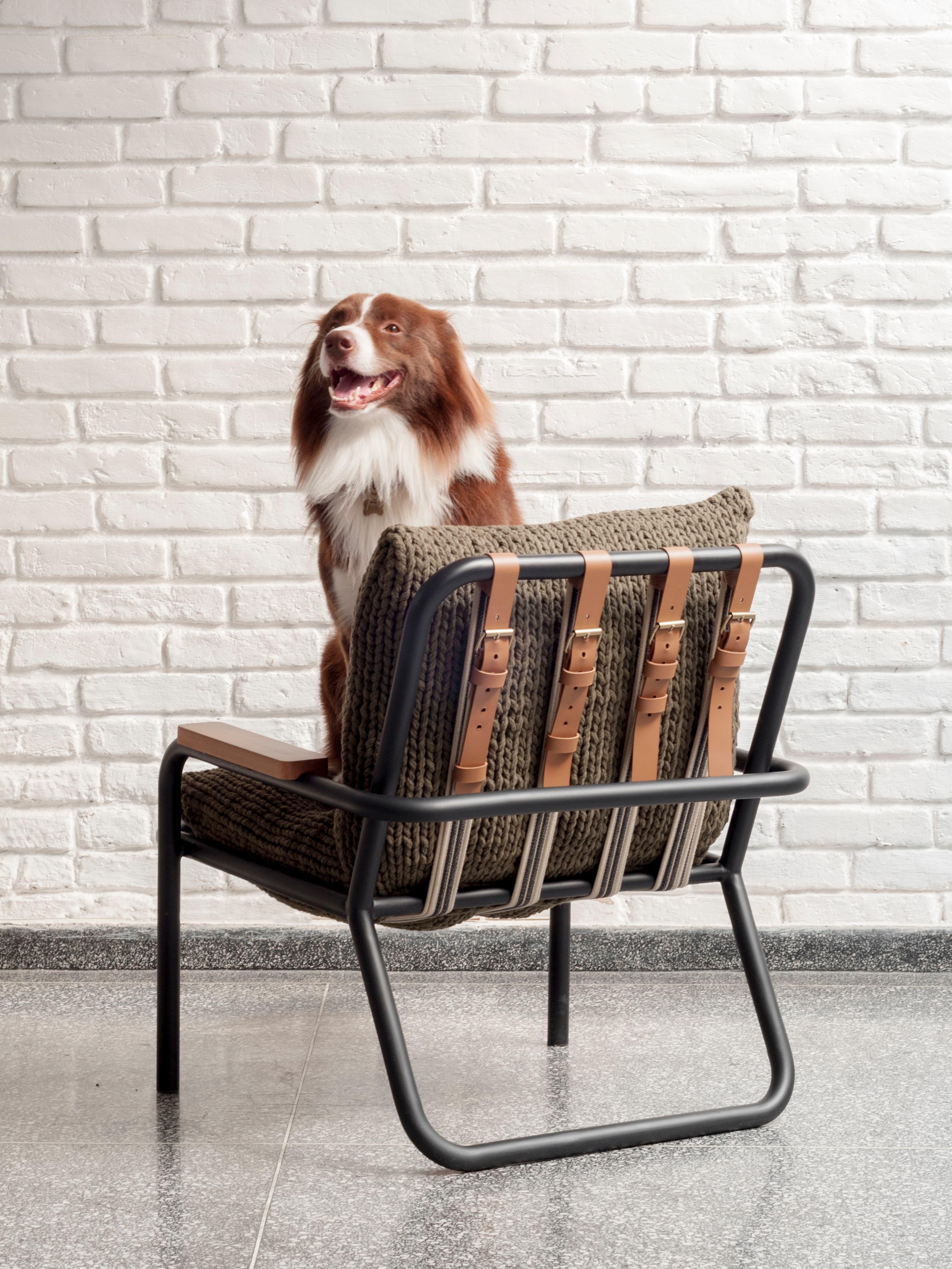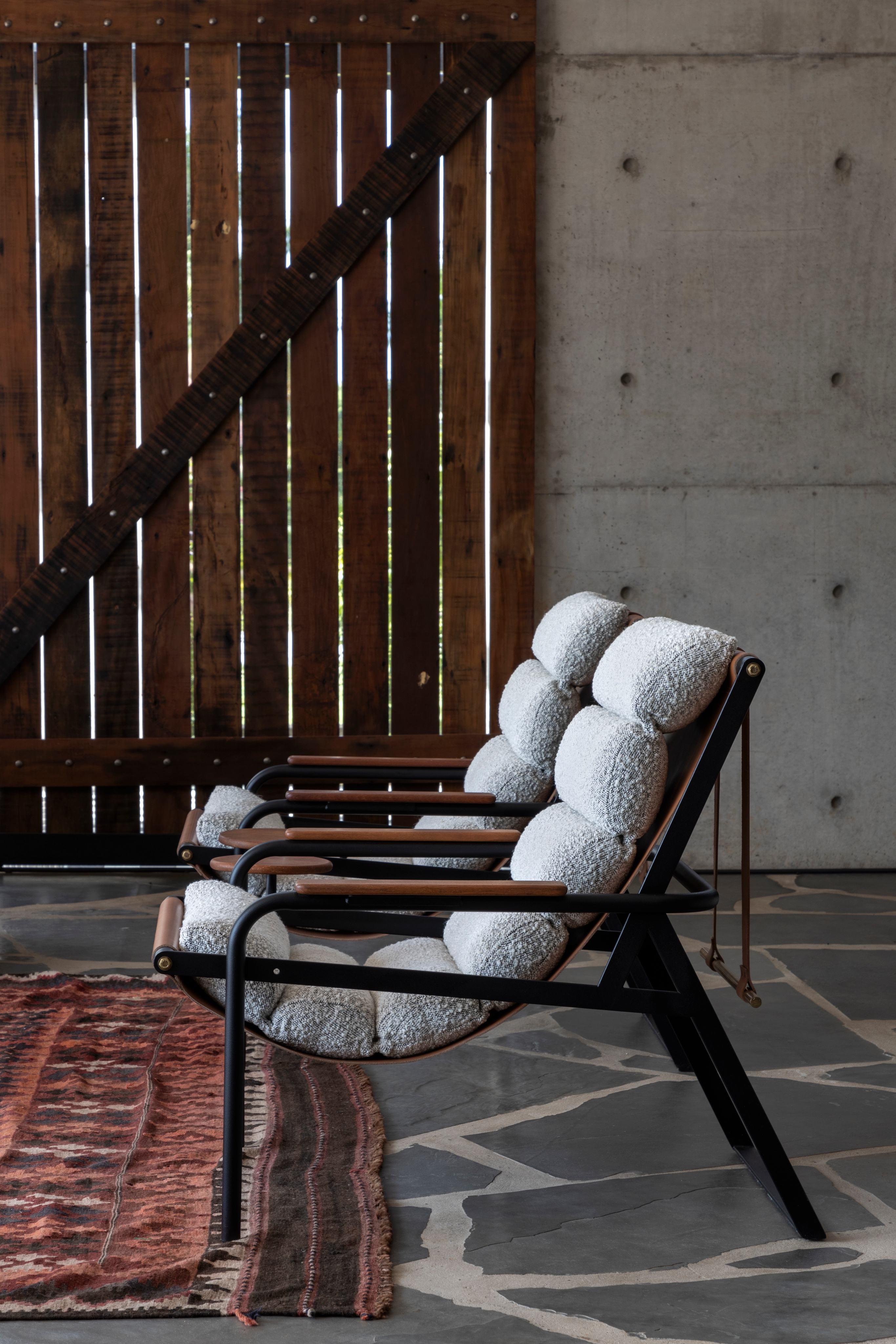 A poltrona Trevo Drink Armor, destaca-se pelo uso de uma malha metálica como apoio do assento, enquanto a poltrona Bay revela suas cintas de forma intencional.