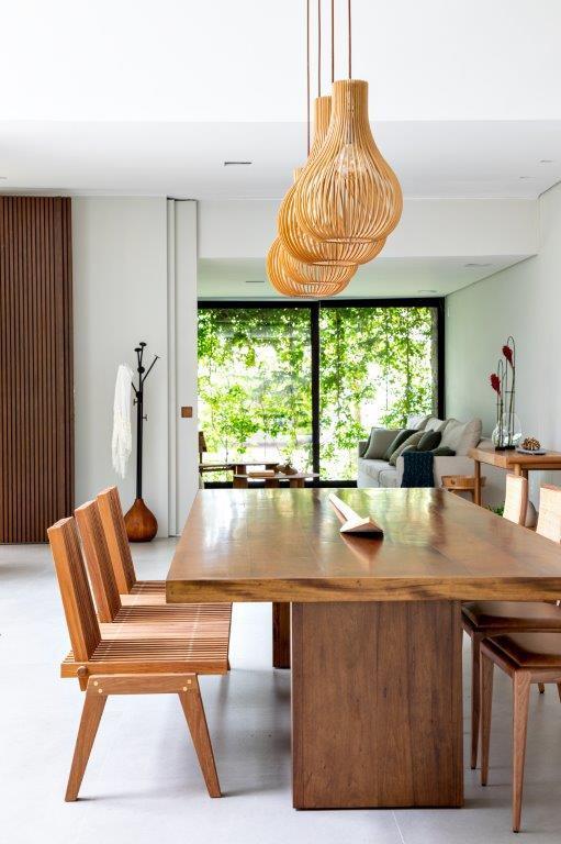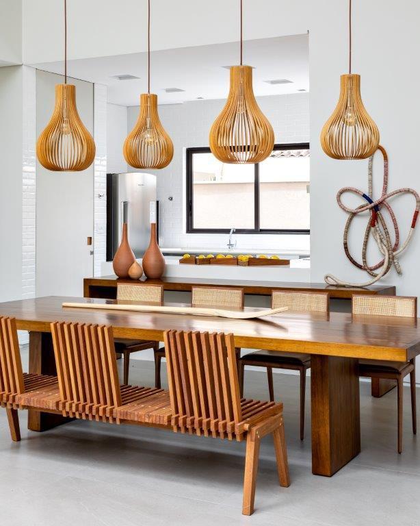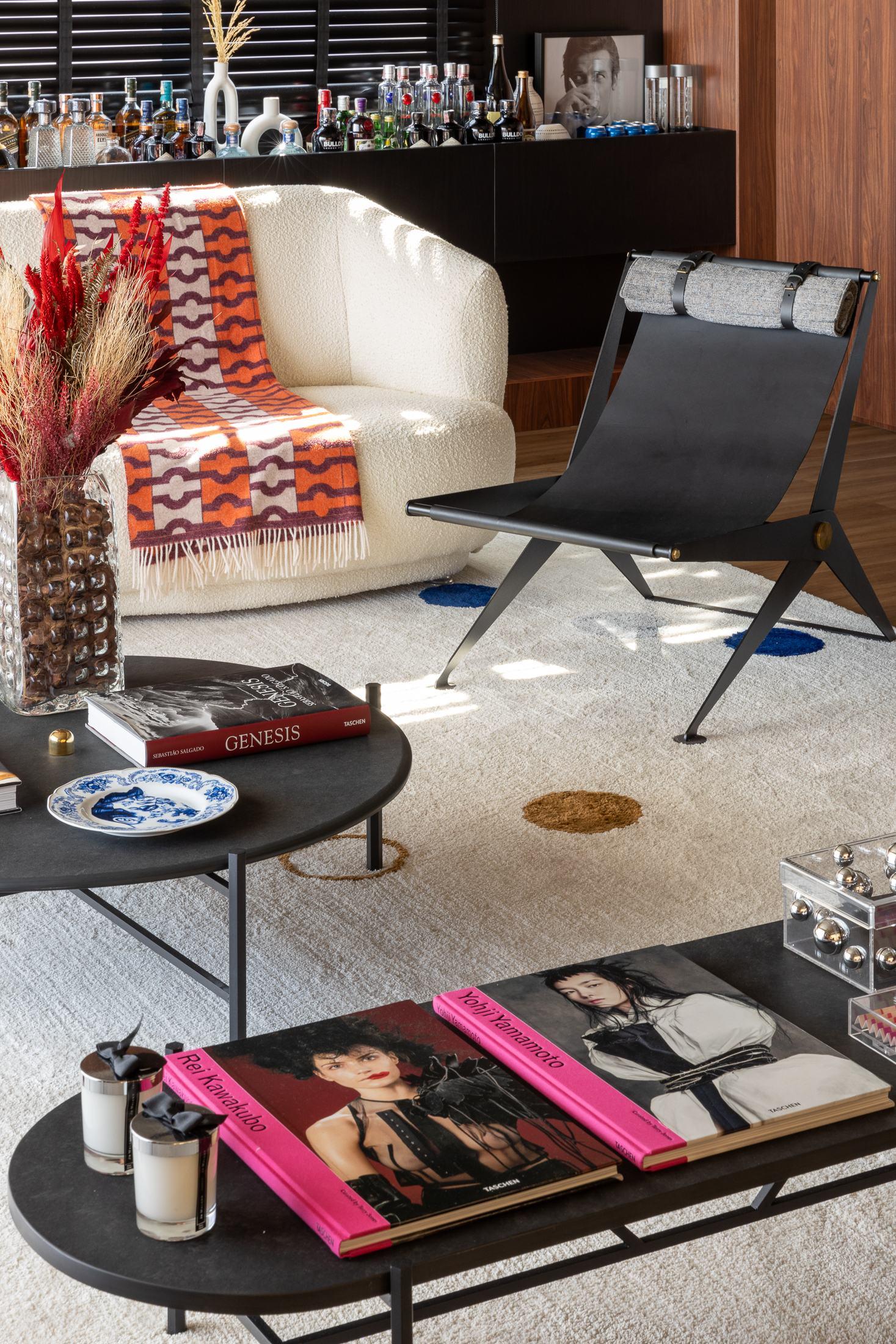 Na sala de jantar (pág 52), as cadeiras Nini e sua estrutura mais delineada e delicada, contrastam com a robustez da Mesa Socks sob o piso de madeira de demolição e criam um equilíbrio sofisticado entre os materiais e as formas presentes no ambiente.