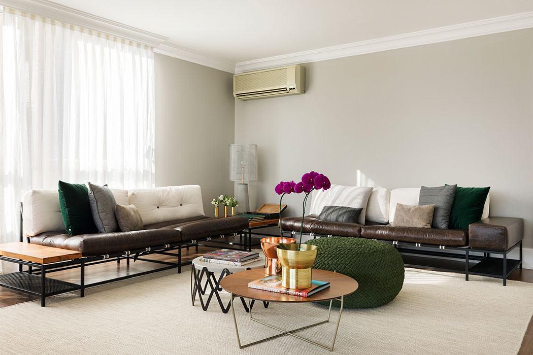 Cadeiras Nini, banco Sittable e sofá Houndog compõem e dão o tom para uma sala aconchegante e cheia de personalidade.