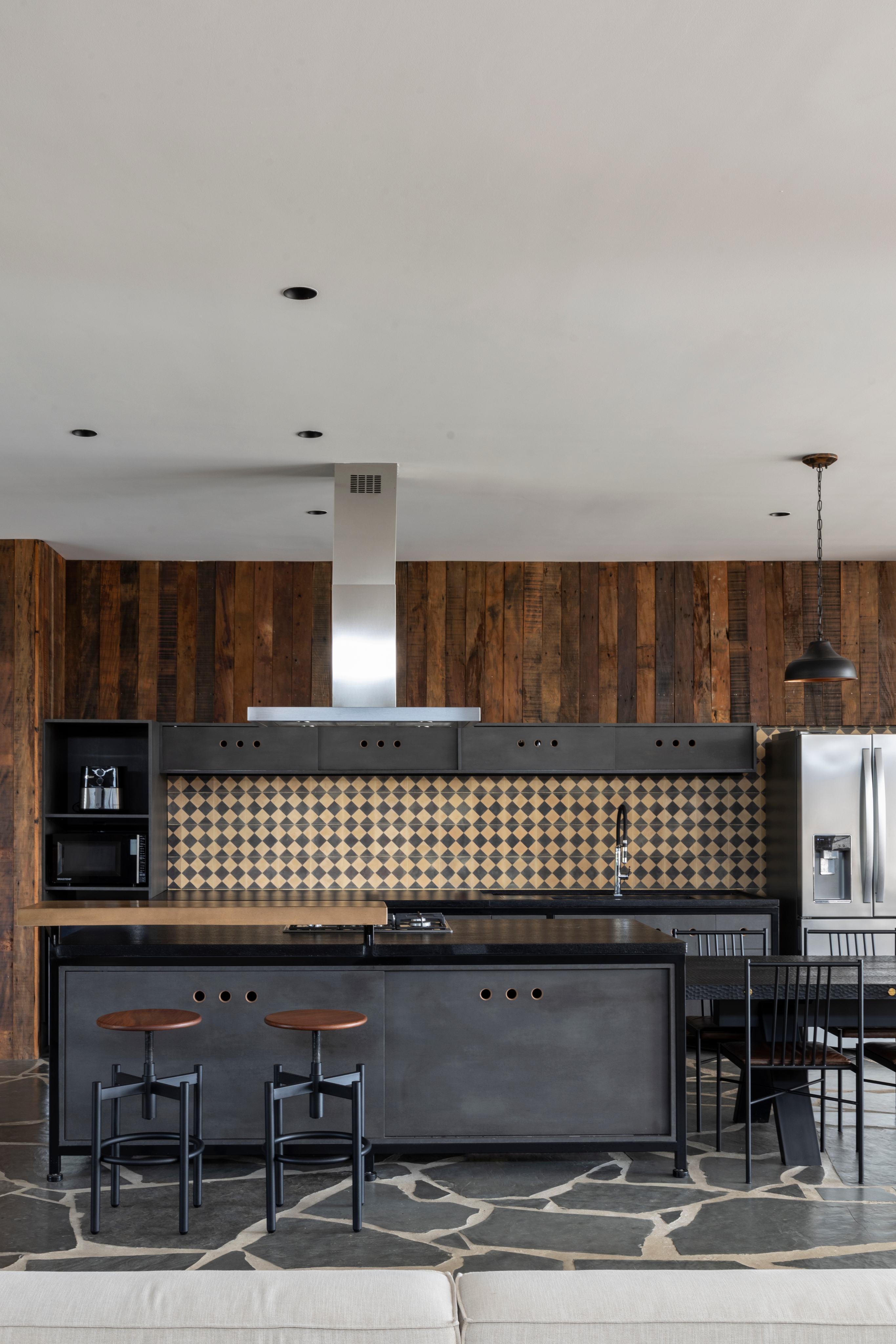 A cozinha tem um conceito aberto, integrado à sala com piso de pedra irregular.