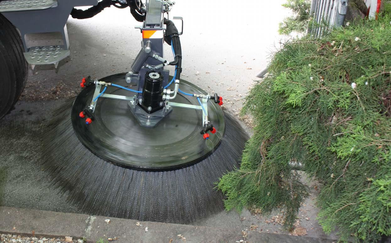 Ampia spazzola frontale con movimento completo a 180°, rappresenta un indispensabile strumento ausiliario per spazzare angoli e canali di scolo e per aumentare la superficie di lavoro.