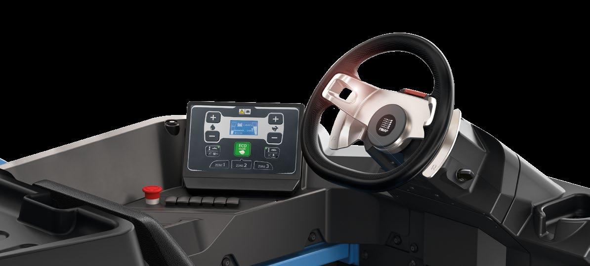 The steering wheel controls offer the operator even greater control when cleaning, and also improve safety by eliminating distractions and letting the operator keep his or her eyes on the zone ahead of the machine