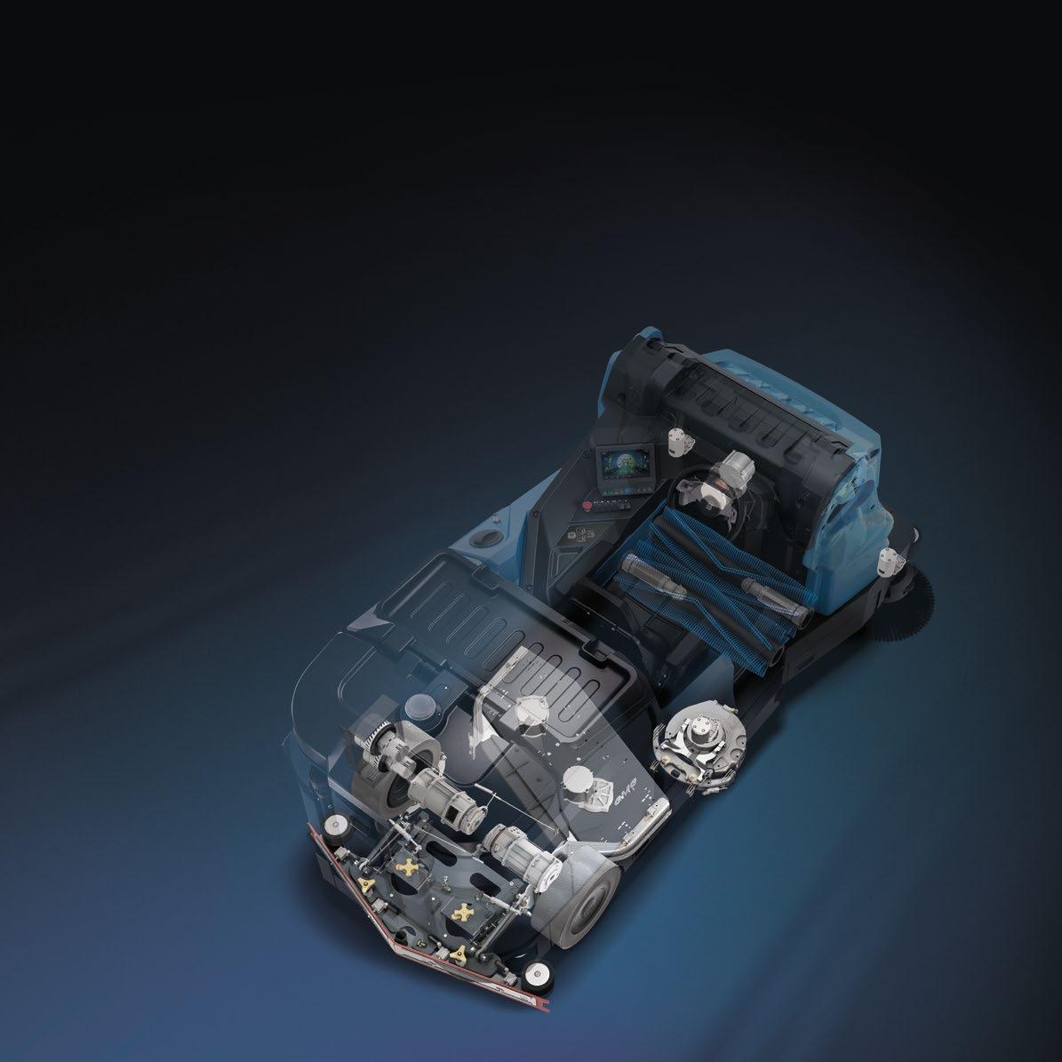 The strength of a real sweeping machine combined with the power of a large scrubbing machine