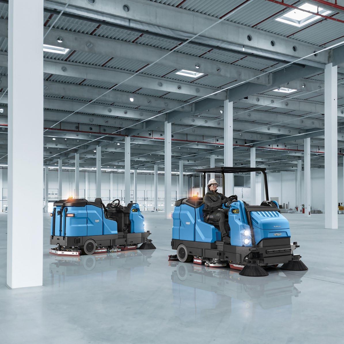 Normally, any dust and solid dirt must first be removed with a sweeping machine, before scrubbing and drying with a scrubbing machine.