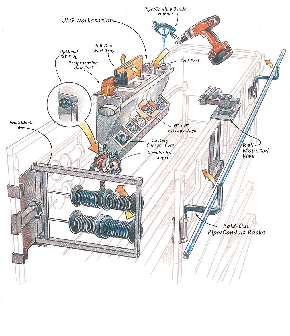 Optional Workstation in the Sky® accessory packages are designed for the specific needs of electricians, plumbers, contractors and plant maintenance professionals.