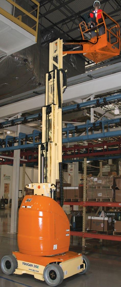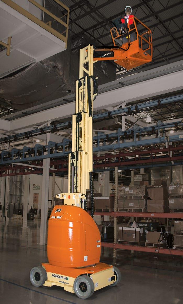 With the JLG Toucan® vertical mast lift, you can meet your overhead challenges head on. Work up, over and around assembly lines, shelving, ductwork or partitions more easily and without interferences. Positioning is easier with a 345o rotating mast, up to 32 ft of lift height and 15 ft of jib reach. With its 500-lb capacity and a long-running, environmentally friendly electric powered drive, the Toucan will help you boost productivity hour by hour, year after year.