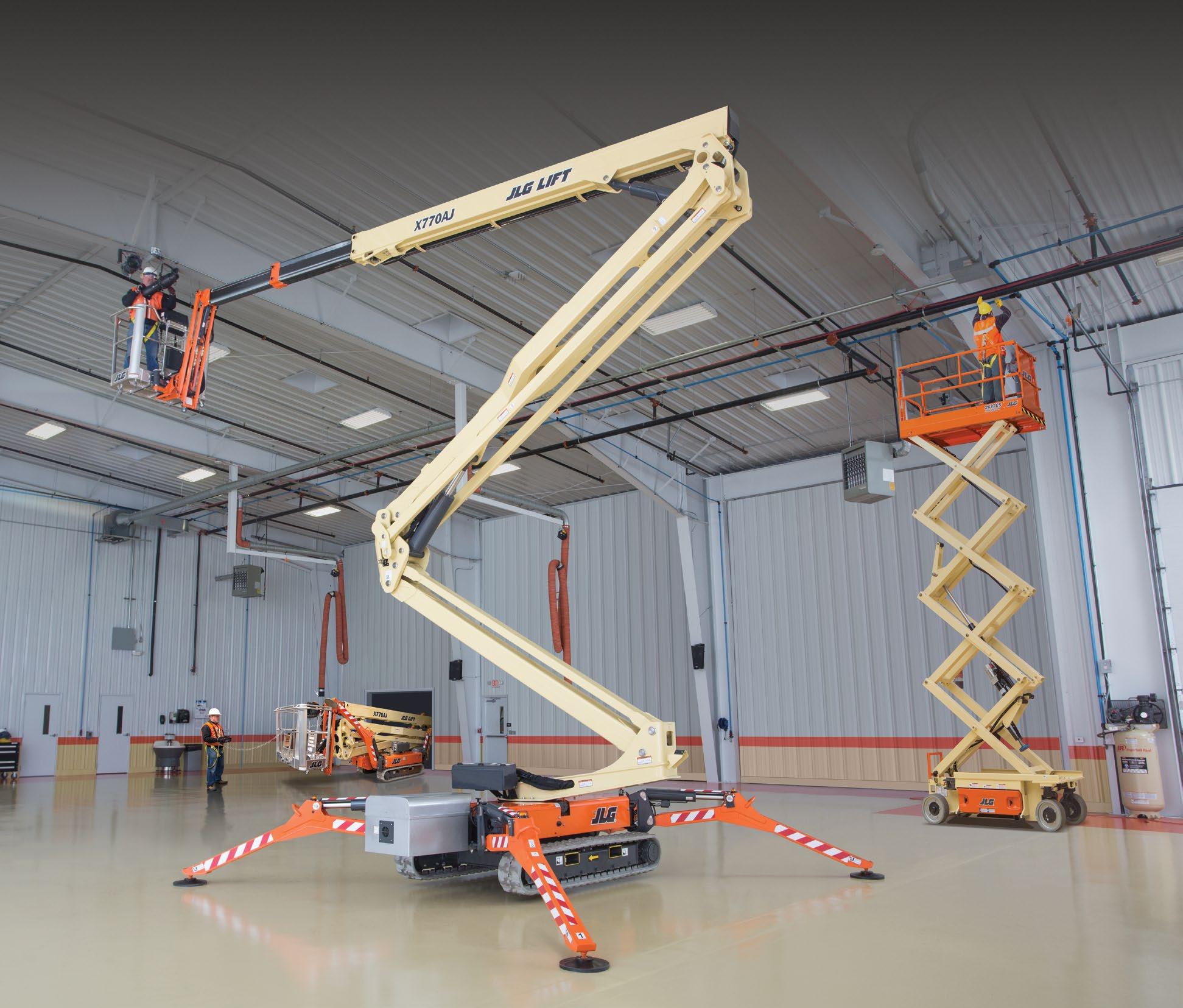 Now you can go more places around the job site thanks to the low weight and rubber tracks on JLG® Compact Crawler Boom lifts. Available in four models with working heights ranging from 50 ft to 106 ft, the compact crawler booms feature a tracked wheel carriage that climbs steps and a narrow chassis for access through gates, yards, standard doorways and public buildings. Its light weight, compact design allows for low floor loading and ease of transport.