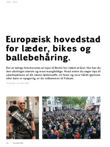 Europæisk hovedstad for læder, bikes og ballebehåring. Der er talrige fetichevents at rejse til Berlin for i løbet af året. Her har du den ubetinget største og mest mangfoldige. Hvad enten du søger tips til udarbejdelsen af dit næste læderoutfit, vil feste og sexe hårdt igennem eller bare er nysgerrig, er du velkommen til Folsom. Tekst Dea Daily
