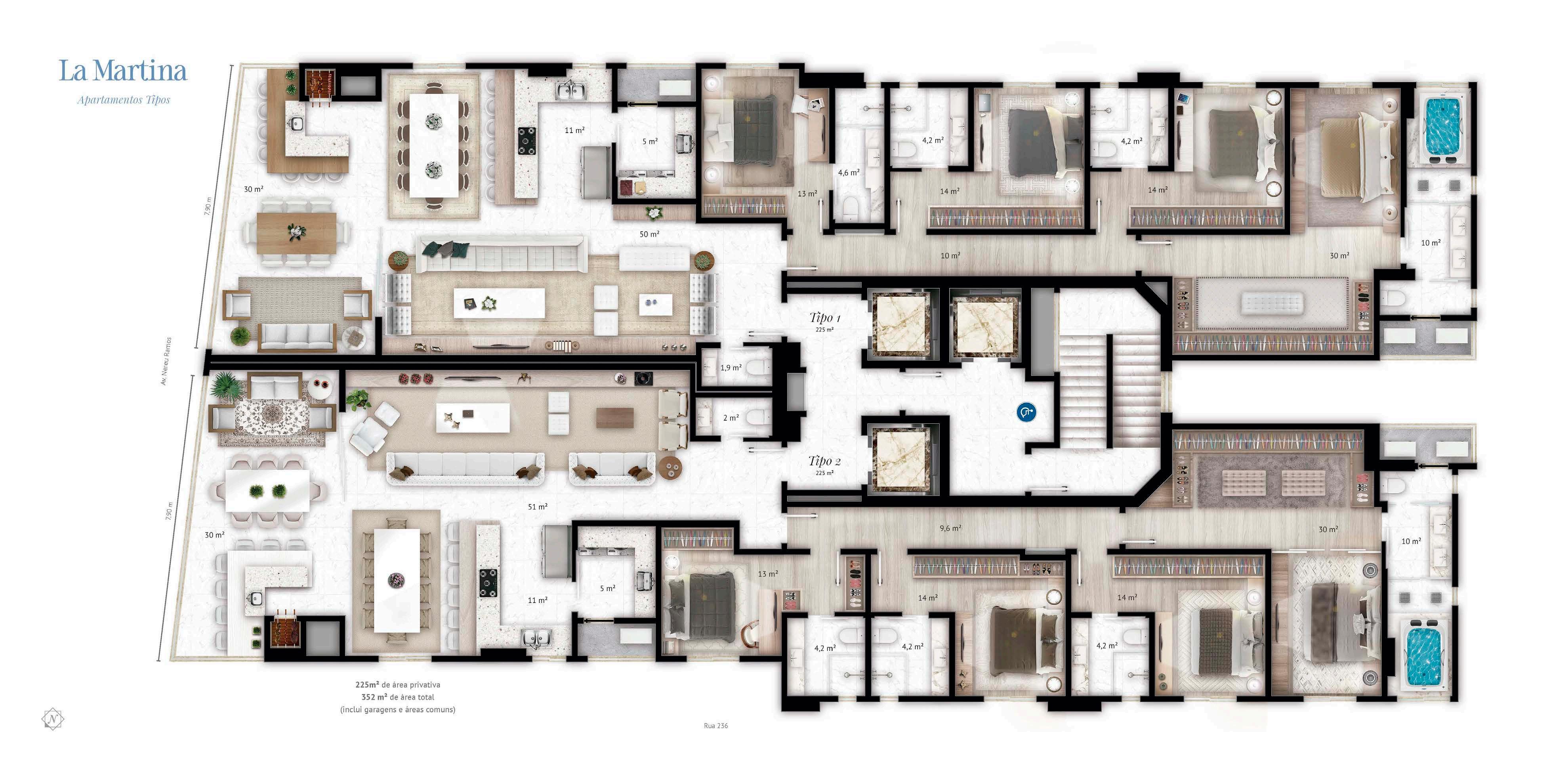 Apartamentos de 04 suites com 225 m2 privativos e 03 vagas de garagem.