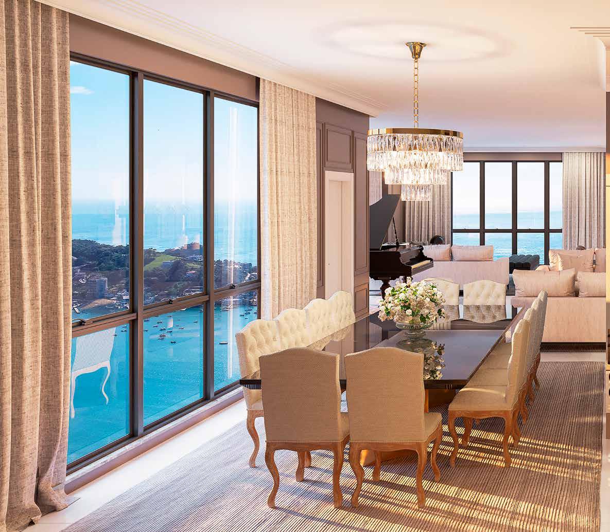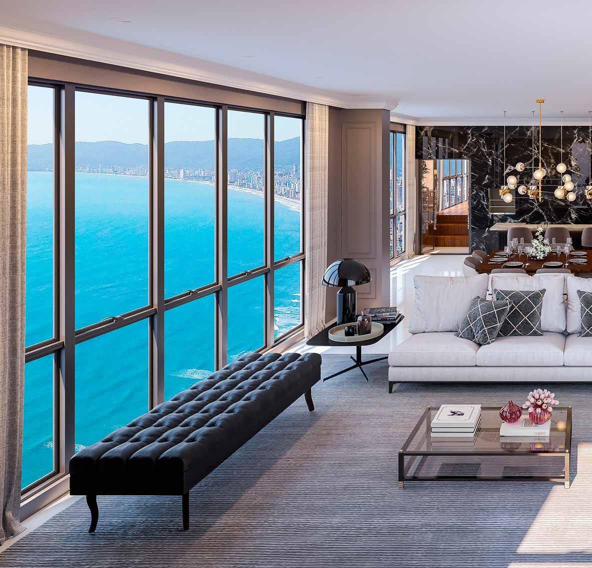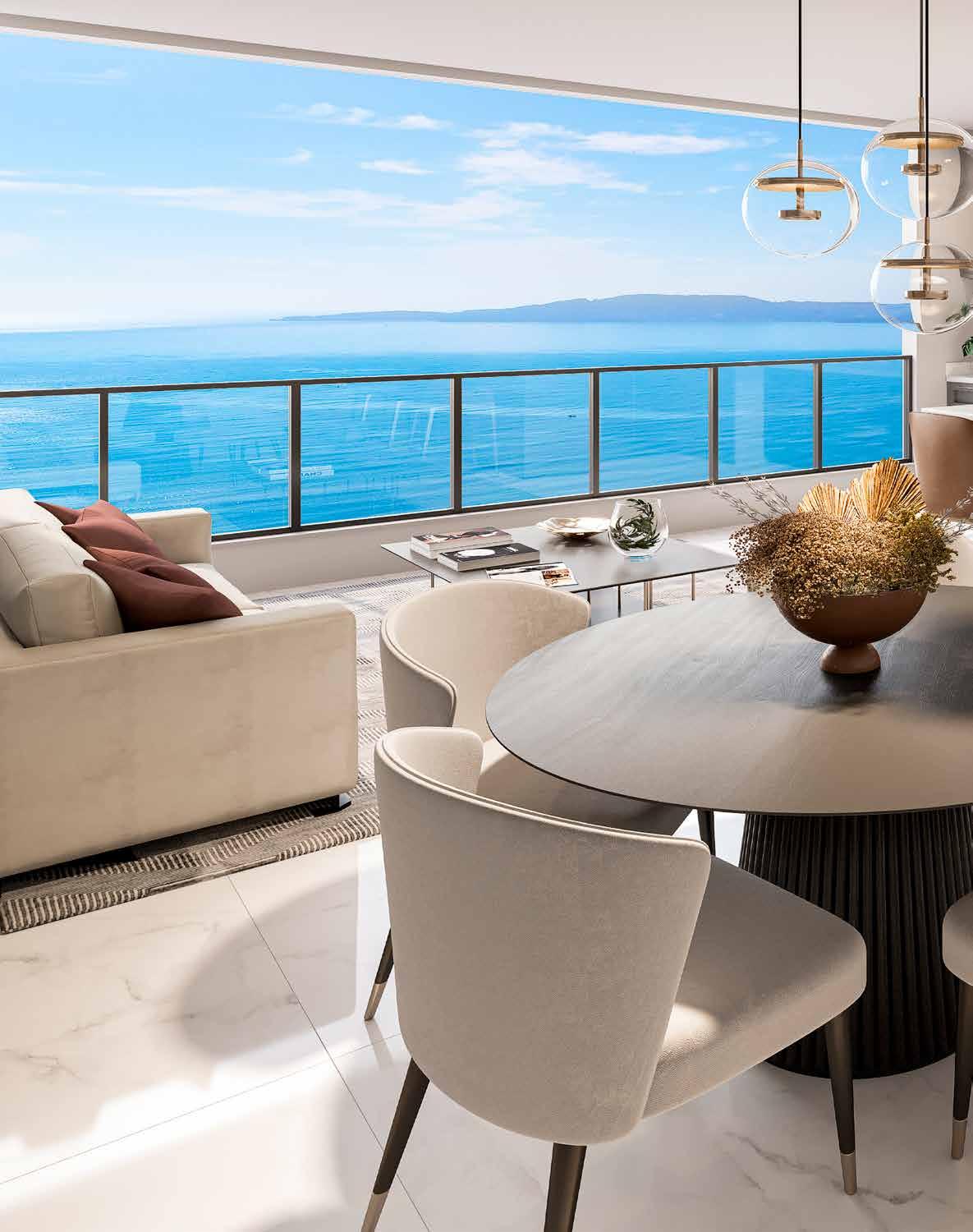 São 23,9 metros de frente com pele de vidro, emoldurando vistas extraordinárias. A sacada de 82 m² possui um spa de frente para o mar.