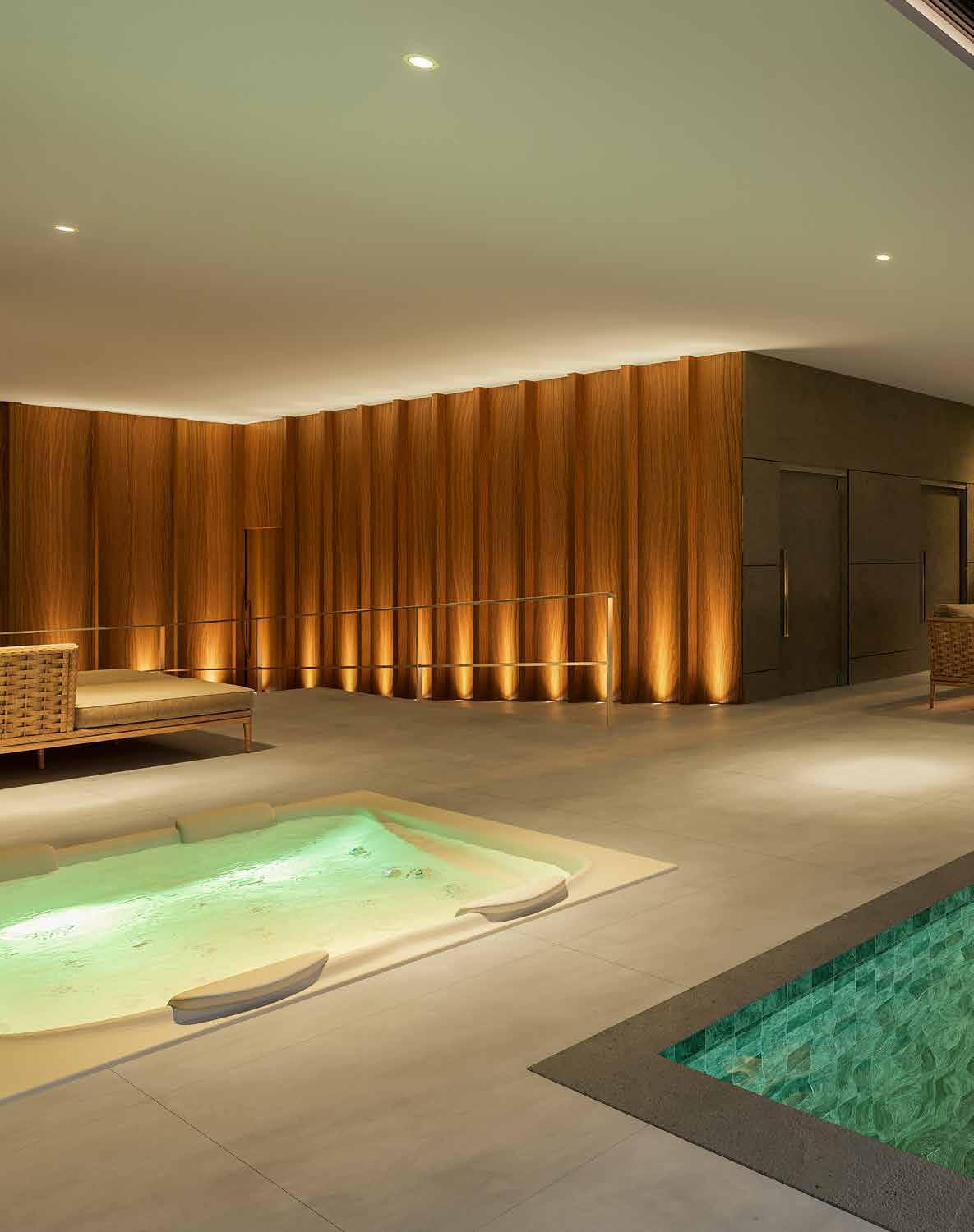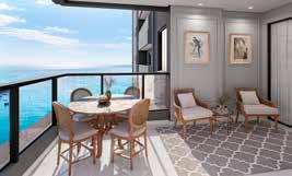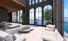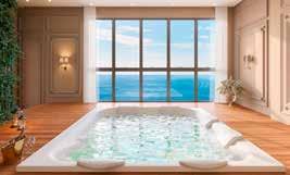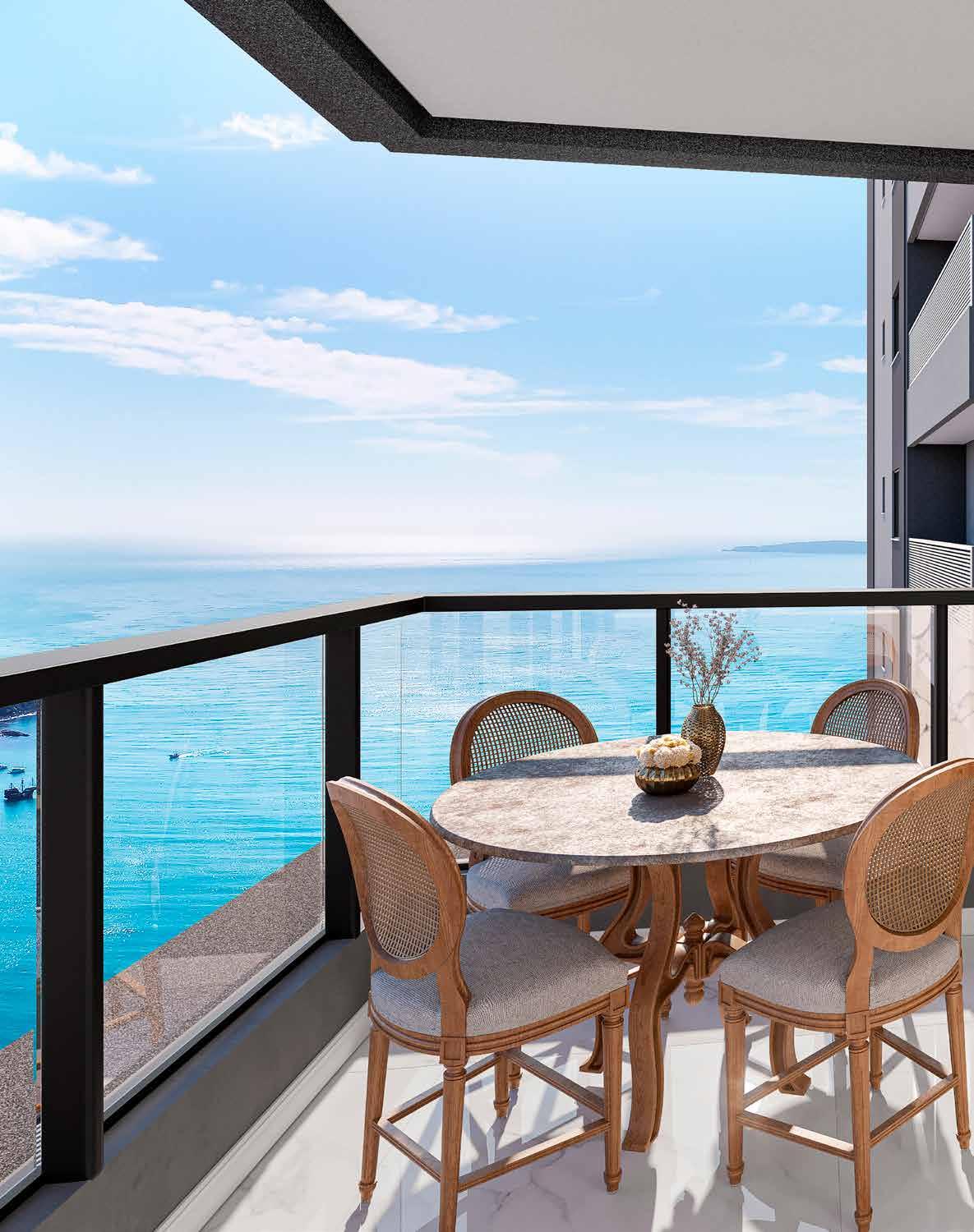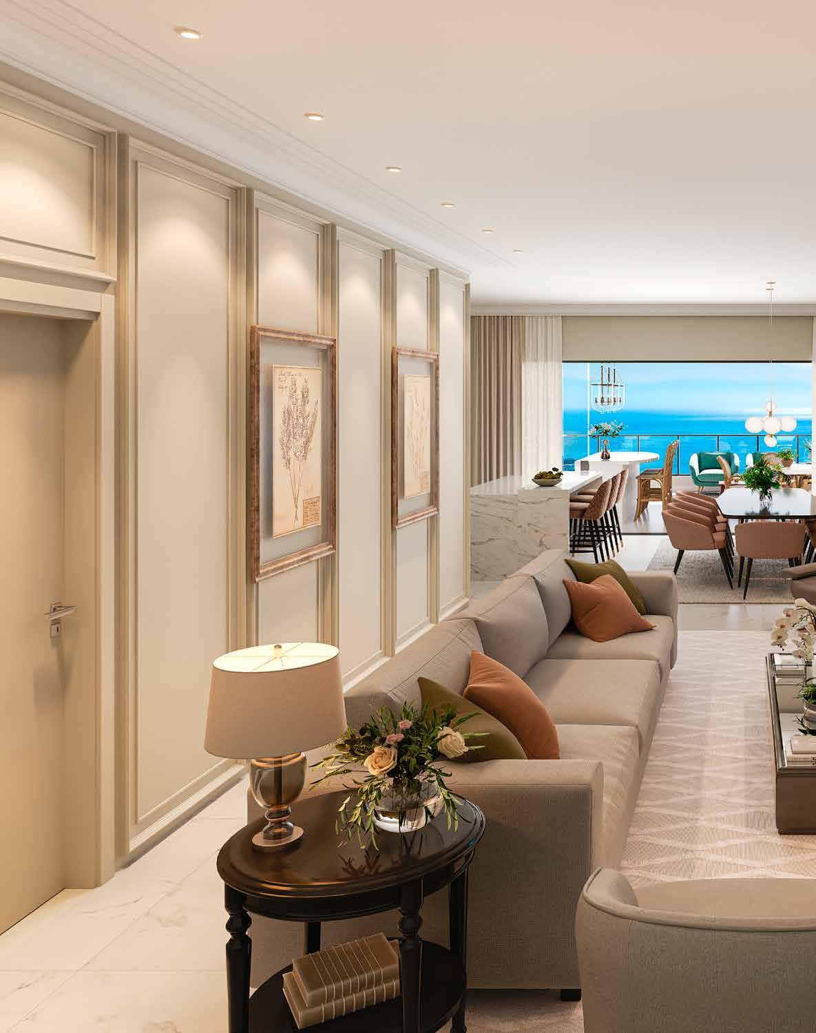 São 23,9 metros de frente com pele de vidro, emoldurando vistas extraordinárias. A sacada de 82 m² possui um spa de frente para o mar.
