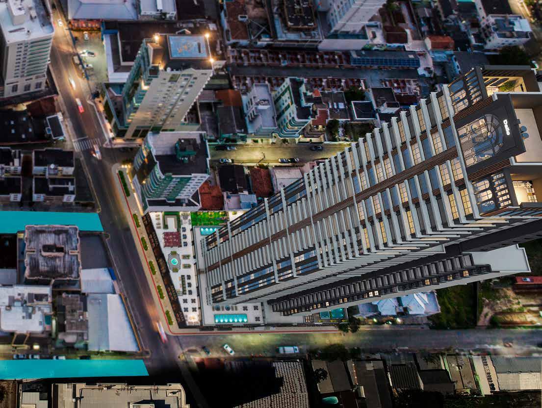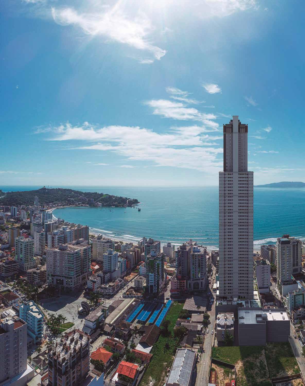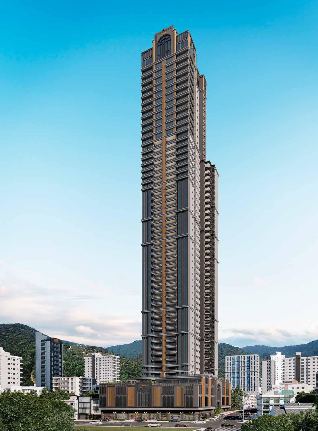 Subindo 54 andares ao céu, abriga 163 residências de luxo, todas com 4 suítes e ao menos 3 vagas de garagem, além de 38 unidades comerciais.