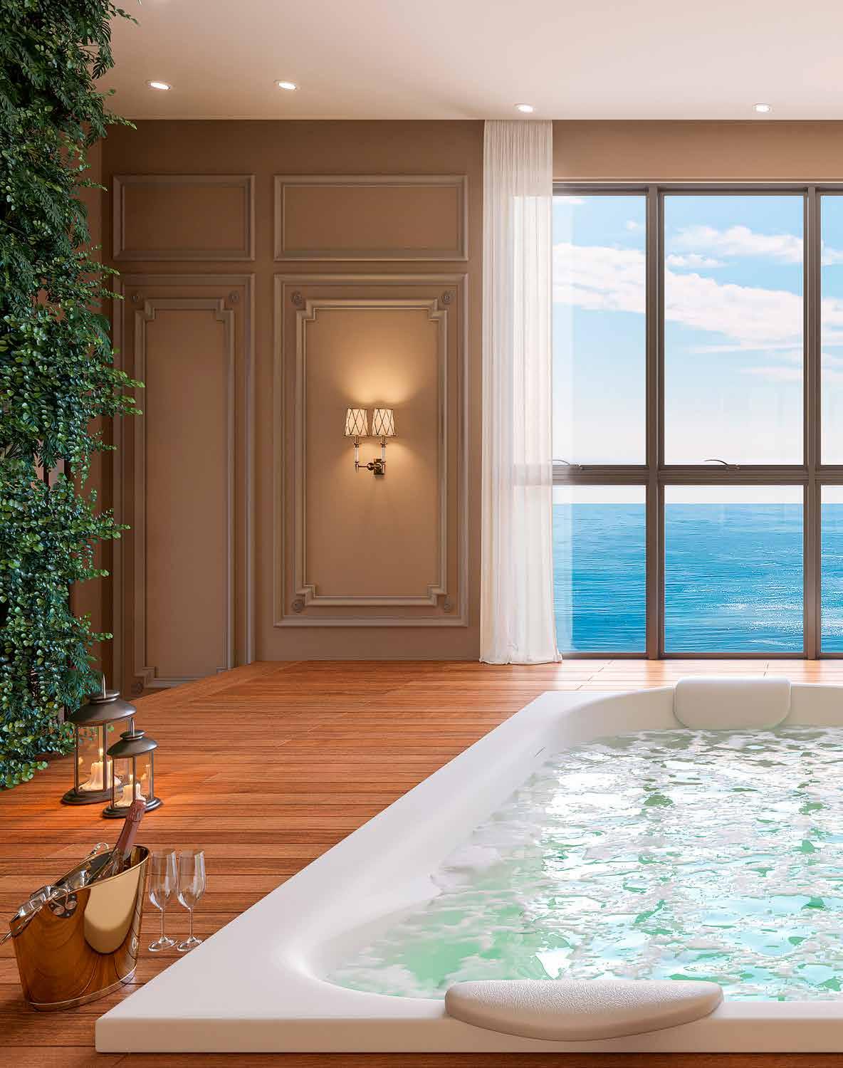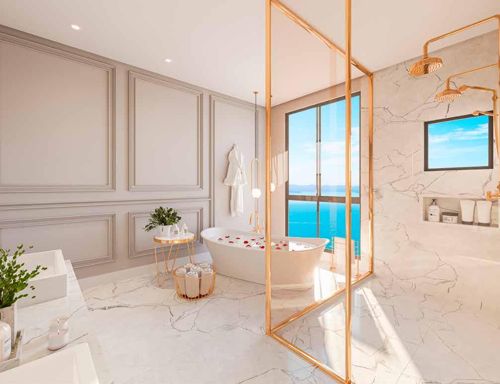 O banheiro possui uma banheira de imersão com vista para o mar, trazendo ao ambiente um diferencial incomparável.