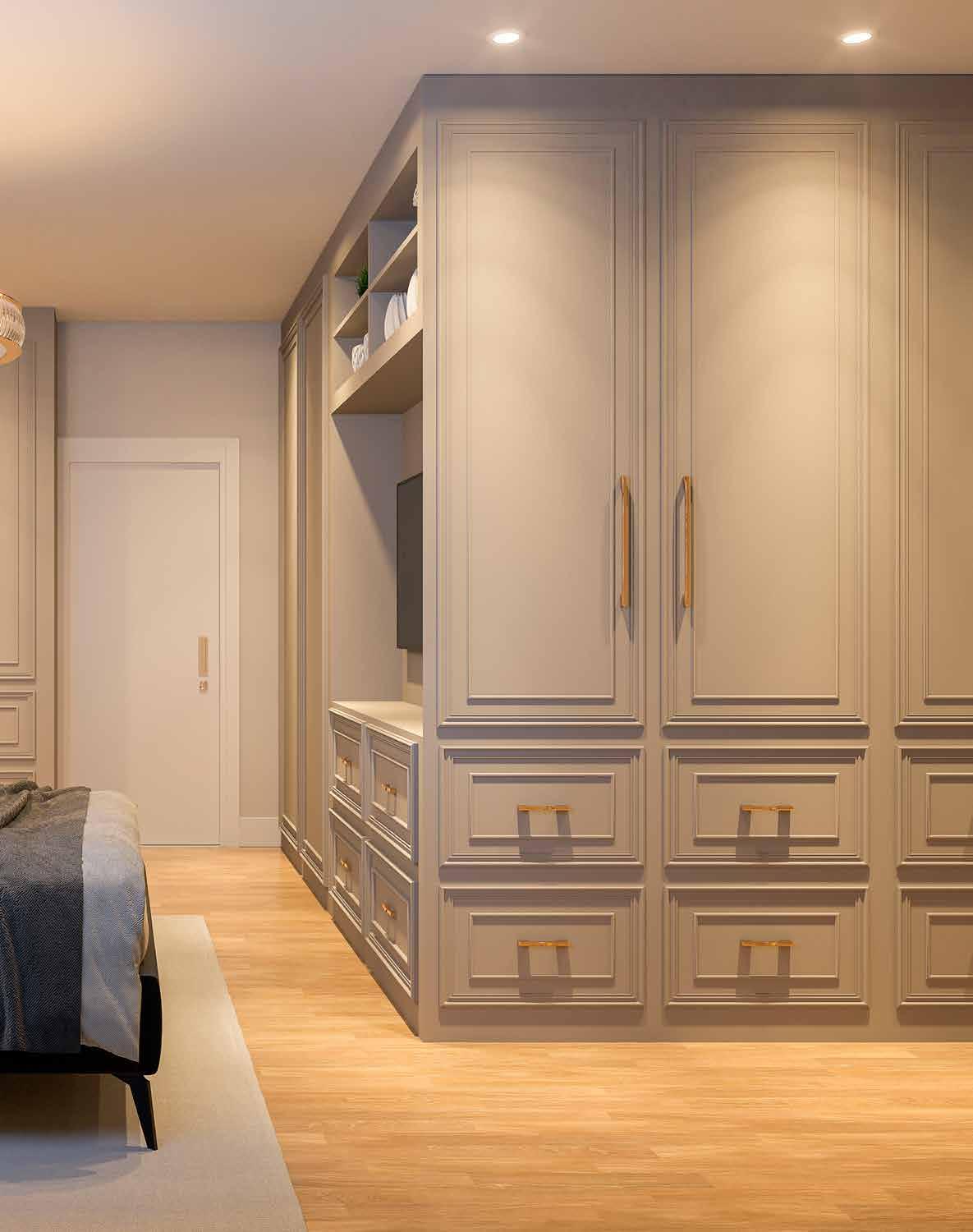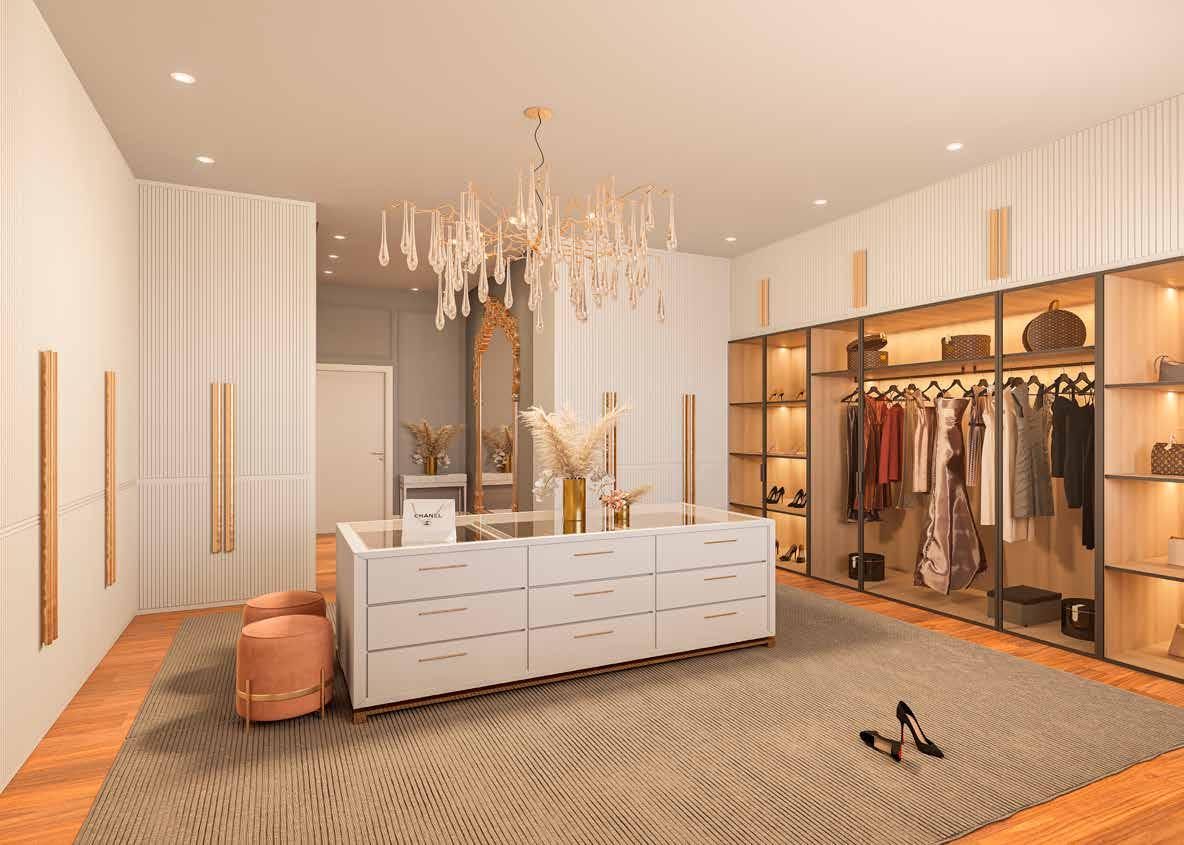 O closet de 40 m² complementa com perfeição a suíte máster de generosos 88 m². Seu piso de madeira natural é mais um aconchegante luxo.