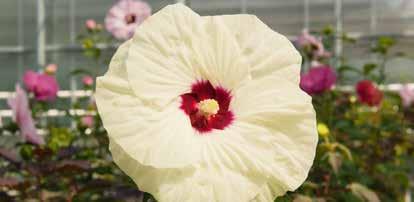 Fiori color crema con delicato occhio lilla, pianta dal portamento compatto.