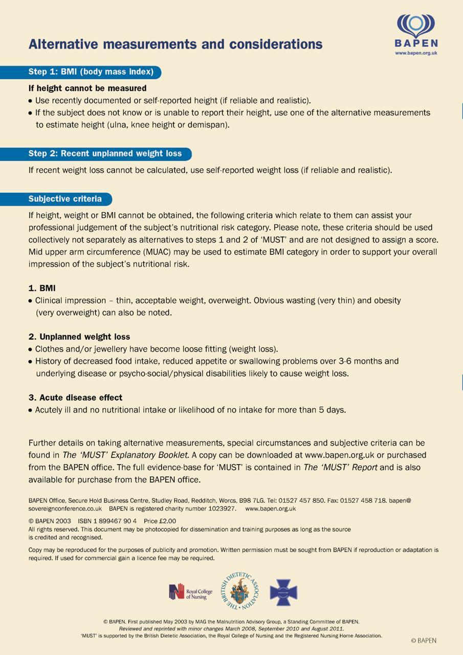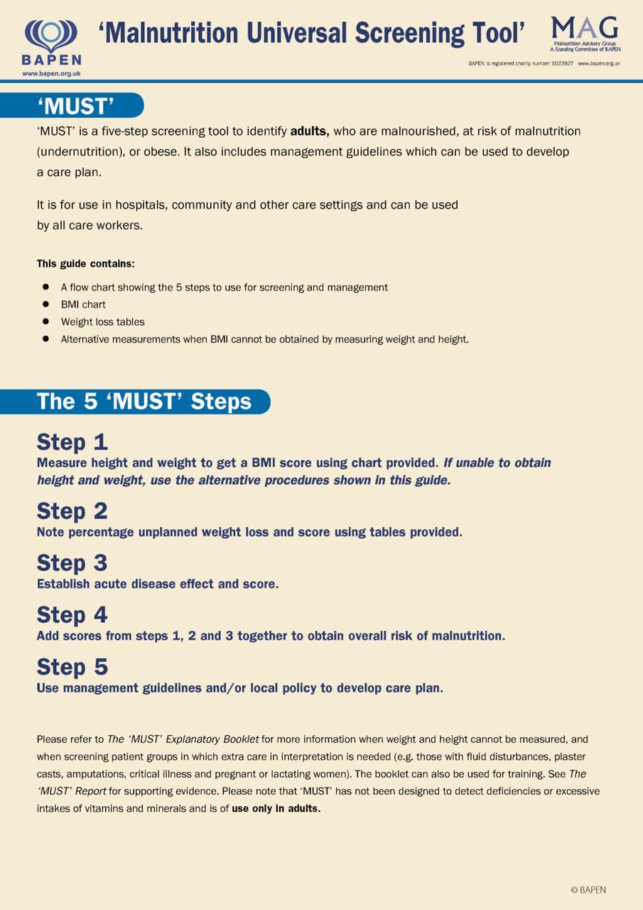 • The MUST assessment tool is included within the nursing documentation booklets used across Provide for adult in-patients. BAPEN explanatory guidance is available in the ward Nutrition folders.