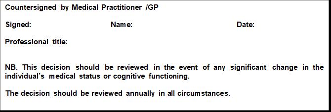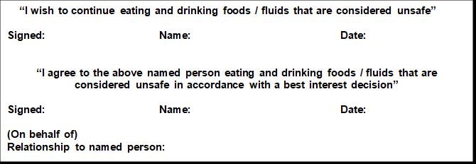 • If the best interest decision is made to support ‘feeding at risk’ then a family member of the person concerned should be assisted to complete, date and sign Appendix 3 ‘Feeding at Risk recording form.’ A relevant medical professional should sign as witness and a medical practitioner (GP for community-based individuals), should countersign the document before it is transferred to the medical record as detailed above.
