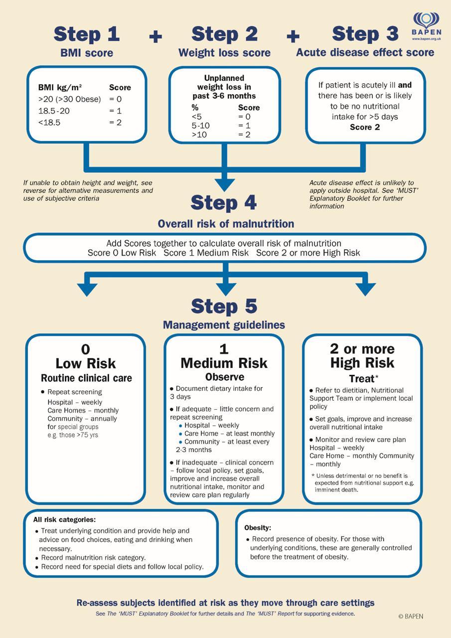 Malnutrition Universal Screening Tool (MUST): A five-step screening tool used to identify adults who are malnourished or at risk of malnutrition