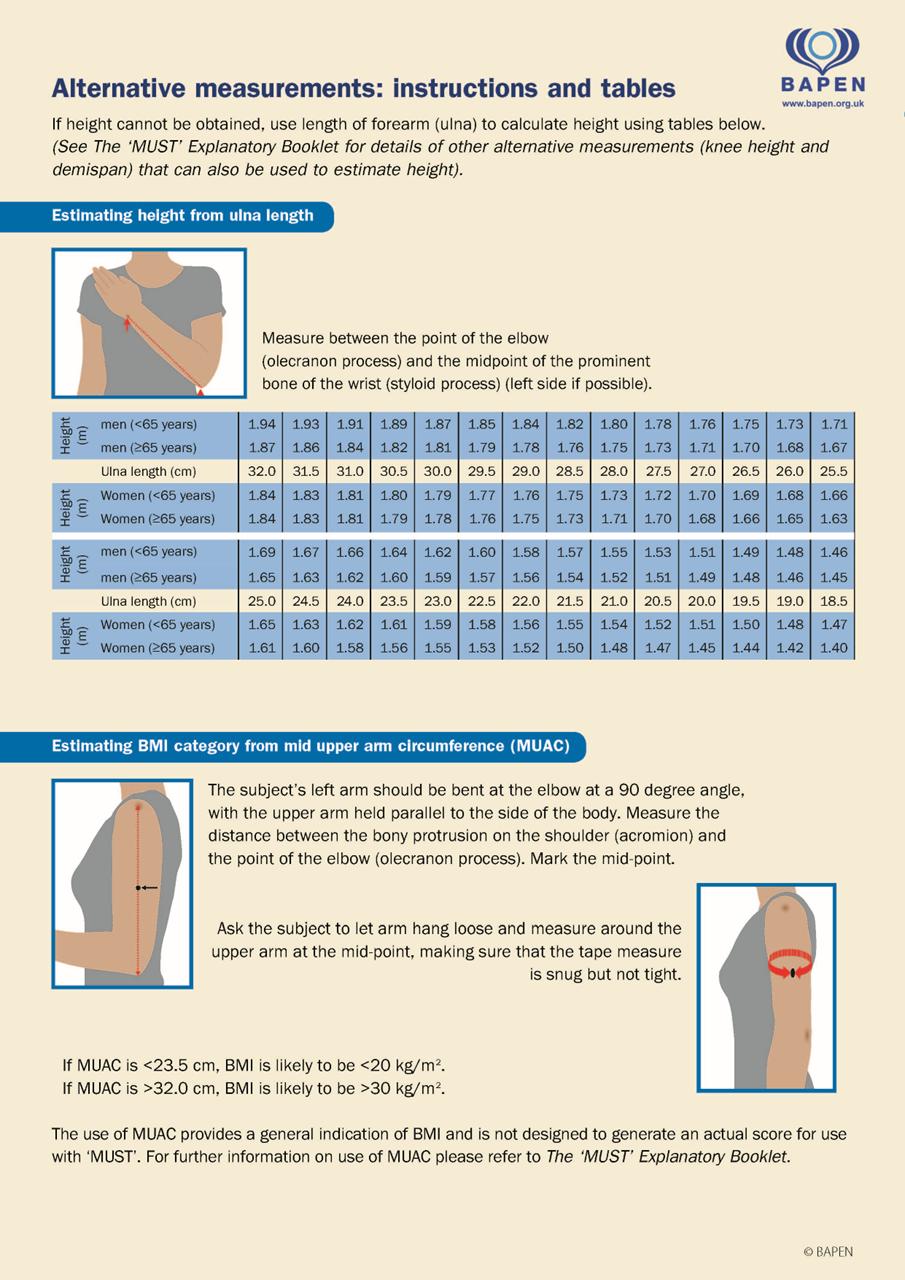 • Each ward or department will have weighing scales and a device for measuring height or use the alternative measurements to estimate height as recommended by BAPEN. It is the Ward’s responsibility to ensure that these devices are available, serviced and maintained according to the manufacturer instructions.