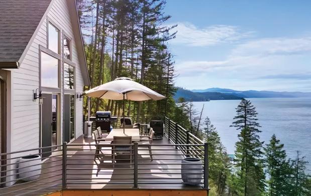 Your picturesque getaway begins in a beautifully designed, contemporary cabin nestled above the glacier-carved lake, surrounded by majestic pines. This peaceful two-bedroom, two-bath private residence features warm, airy interiors with air conditioning and heating, a private dock and an outdoor overlook deck, perfect for sipping coffee as the sun greets you in the morning.