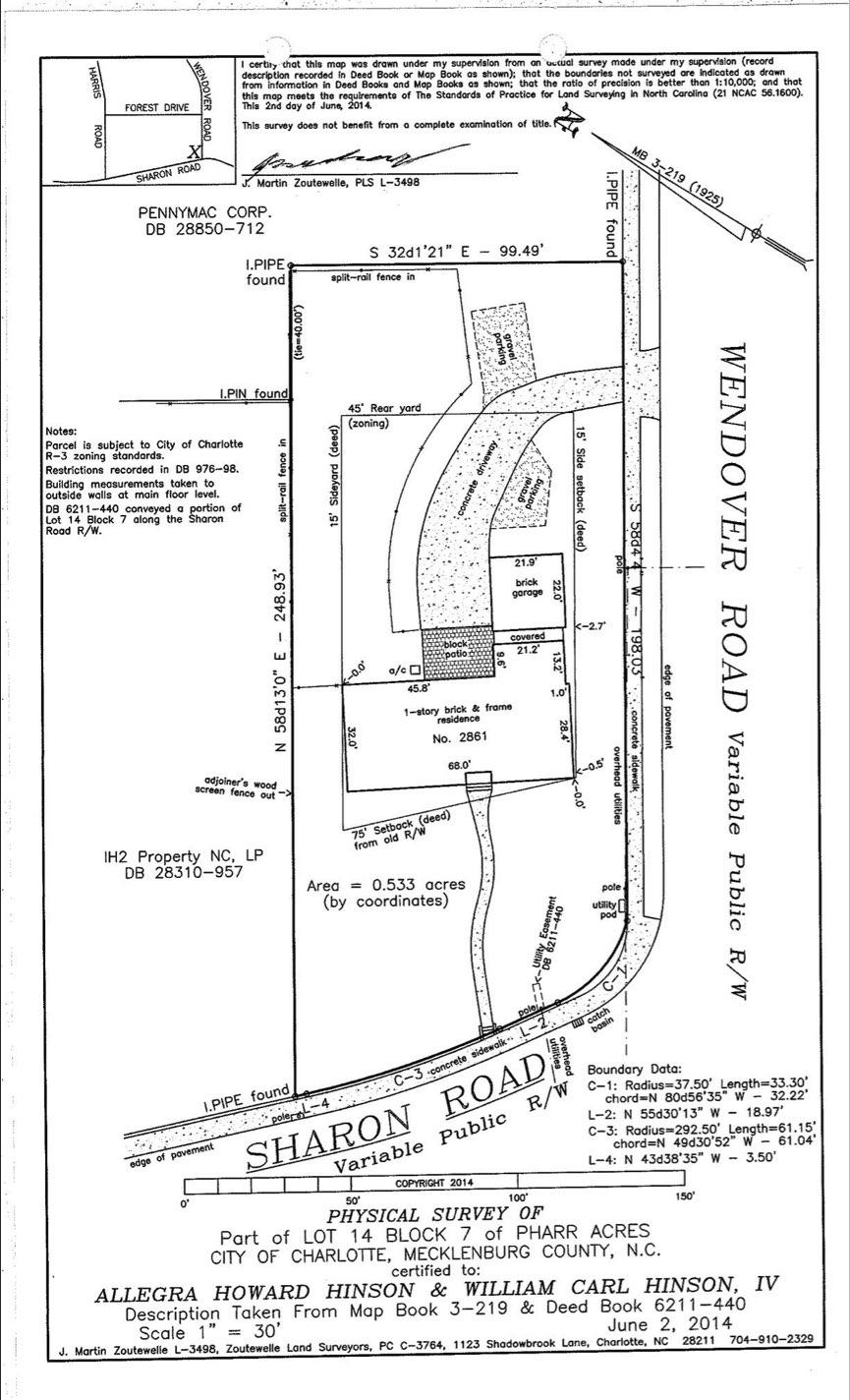 ne Tcertny-that this map was drawn under my supervision from on ocusa survey made under my supervision (record description recorded in Deed Book or Map Book as shown); thot the boundaries not surveyed are indicated as draw in information in Deed Booka and Mop Books 3 shown; that the ratio of precision ie better than 1:10,000; and thot is map meats the remente of Tha Standards of Practice for Land Surve; In Nortfi Carotina (21 NCAC 56.1600) Se gee sont heregu a ? » This surveydoesnot benefit from o complete examination «0 > Y Mortin Zoutewelle, PLS L-3498 PENNYMAC CORP. DB 28850-712 S$ 32d1'21" ? ? 99.49" LPIPEg Notes: Parcel is subject to City of Charlotte R=3 zoning stondords, Restrictions recorded in 0B 976-88. Building measurements taken to outside walls at main floor level. DB 6211-440 conveyed a portion of Lot 14 Block 7 along the Sharon Road R/W. IH2 Property NC, LP DB 28310-957 Area = 0.533 acres (by coordinates) % Boundary Data: LE? \ BOPaI neti aaise Ee 3c L-2: N 55d30'13" W - 18.97" pub C-3: Radius=292.50"_Length=61.15'chord=N 49430°52? W ? 61.04? L-4: N 43d38°35" W - 3.50 COPYRIGHT 2014, 50° 100° 150" PHYSICAL SURVEY OF Part of LOT 14 BLOCK 7 of PHARR ACRES CITY OF CHARLOTTE, MECKLENBURG COUNTY, N.C. certified to: ALLEGRA HOWARD HINSON & WILLIAM CARL HINSON, IV Description Taken From Map Book 3-219 & Deed Book 6211-440 Scale 1? = 30° June 2, 2014 J. Martin Zoutewelle L--3498, Zoutewslle Land Surveyors, PC C-3764, 1123 Shadowbrook Lone, Charlotte, NO 28211 704-910-2329