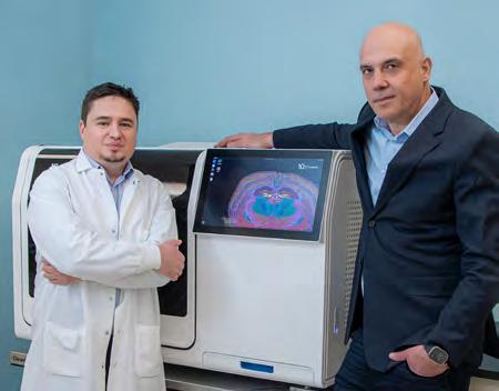 (Bottom) Dr. Brian Piening, program director, Providence Genomics and associate member and chief, Immunogenomics Laboratory, and Dr. Carlo Bifulco, chief medical officer, Providence Genomics and member and director of translational molecular pathology, stand next to Xenium Analyzer, a genomics tool crucial to their AI work.