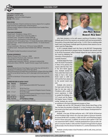 THE CRAIG STEWART FILE Full Name: Craig M. Stewart Birthplace: Newcastle, United Kingdom Family: Wife, Jessica EDUCATION • Earned a Bachelor of Sports and Exercise Science degree from Loughborough University (Loughborough, United Kingdom) • Earned a master’s degree in business administration from Franklin Pierce University in 2004 COACHING EXPERIENCE • Head Coach - Providence College (2012-) • Head Coach - Franklin Pierce University (2008-11) • Assistant Coach - Providence College (2006-08) • Assistant Coach - Northeastern University (2005-06) • Head Coach U17/18 Academy Team - FC Greater Boston Bolts (2008-Present) • Assistant Coach - British University Student-Athlete - FC Greater Boston (2010 - Present) • Camp Coordinator - Elite Soccer 150 Soccer Camp (2006-09) • Academy Coach - Newcastle United Football Club (1999-02) - United Kingdom • FA (English Football Association) Licensed Coach PLAYING EXPERIENCE • Western Pioneers (USL 2 Semi pro - 2008) • New Hampshire Phantoms (USL 2 Semi pro - 2005-07) • Franklin Pierce University (2003-04) • Loughborough University (1999-02) - led team to national title • Newcastle United (1990-98) - English Premier League Youth Academy HONORS • NSCAA/Mondo Division II East Region Coach of the Year (2010 & 2011) • Northeast 10 Conference Coach of the Year (2010) • NSCAA All American at Franklin Pierce and Northeast 10 Player of the Year (2004) • Led FPU to the NCAA Final Four (2011), Elite Eight (2010) and Sweet 16 (2009) • Led FPU to Northeast 10 Tournament and Regular Season titles (2010 & 2011) CAREER RECORD AS HEAD COACH Year Record Postseason 2013 12-6-4* NCAA Tournament & BIG EAST Tournament 2012 4-10-2* -2011 21-1-1^ NCAA Final Four Northeast 10 Tournament & Regular Season Champs. 2010 17-2-2^ NCAA Elite Eight Northeast 10 Tournament & Regular Season Champs. 2009 13-5-3^ NCAA Tournament Sweet 16 Total 67-24-12 Overall Total 16-16-6 at Providence College * - at Providence College // ^ - at Franklin Pierce University