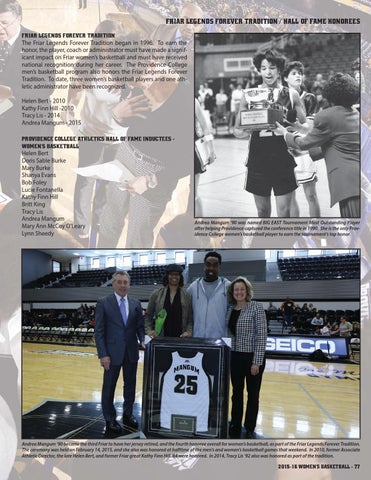 Andrea Mangum ‘90 became the third Friar to have her jersey retired, and the fourth honoree overall for women’s basketball, as part of the Friar Legends Forever Tradition. The ceremony was held on February 14, 2015, and she also was honored at halftime of the men’s and women’s basketball games that weekend. In 2010, former Associate Athletic Director, the late Helen Bert, and former Friar great Kathy Finn Hill ‘84 were honored. In 2014, Tracy Lis ‘92 also was honored as part of the tradition.