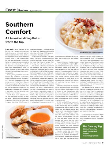 brushed with a not overly sweet housemade barbecue sauce. The Meatloaf ($11.99) is a meat lover’s dream, a thick slice of Angus beef flavored with bacon and mushrooms. The best thing I ever ate at The Dancing Pig is the Angus Prime Rib ($18.99). I asked for an end cut, which I’ve always found has more seasoning, and therefore more flavor. The risk with an end cut is that it is often too well done, but Chef Smith manages to present a prime rib end cut that has a deep brown, flavorful crust and a very pink, tender interior. This magnificent cut of meat sat atop creamy Yukon Gold potatoes, with delicious creamed spinach on the side. The desserts ($5.99 each) at The Dancing Pig are as all-American as the rest of the menu. There’s a respectable Chocolate Truffle Cake coated with dark chocolate ganache and a perfectly fine Fried Cheesecake drizzled with caramel or blueberry sauce. But if you’re really lucky, you’ll be at The Dancing Pig on a night when a special dessert is offered: The Dancing Pig Newtons. These are ladyfinger sandwiches, filled generously with a fine figgy spread, sitting in a pool of crème anglaise. It just doesn’t get any better than that. Linda Beaulieu is the author of The Providence and Rhode Island Cookbook, available at stores throughout the state.