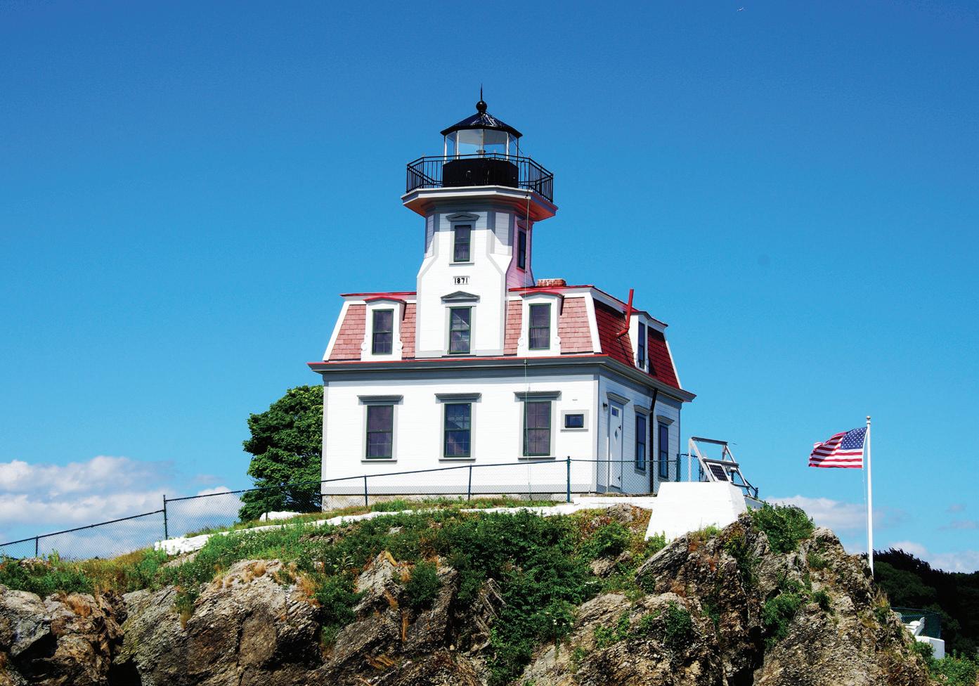 Paiva explains that the site of Pomham Rocks was chosen in 1871 to help an increasing volume of shipping tra c safely travel to and from the Port of Providence. “The northernmost lighthouse in Narragansett Bay, it was designed by Vermont architect Albert Dow in a French empire mansard style, with seven rooms and a 42-foot tower,” says Paiva. “It has been listed in the National Register of Historic Places since 1979.”